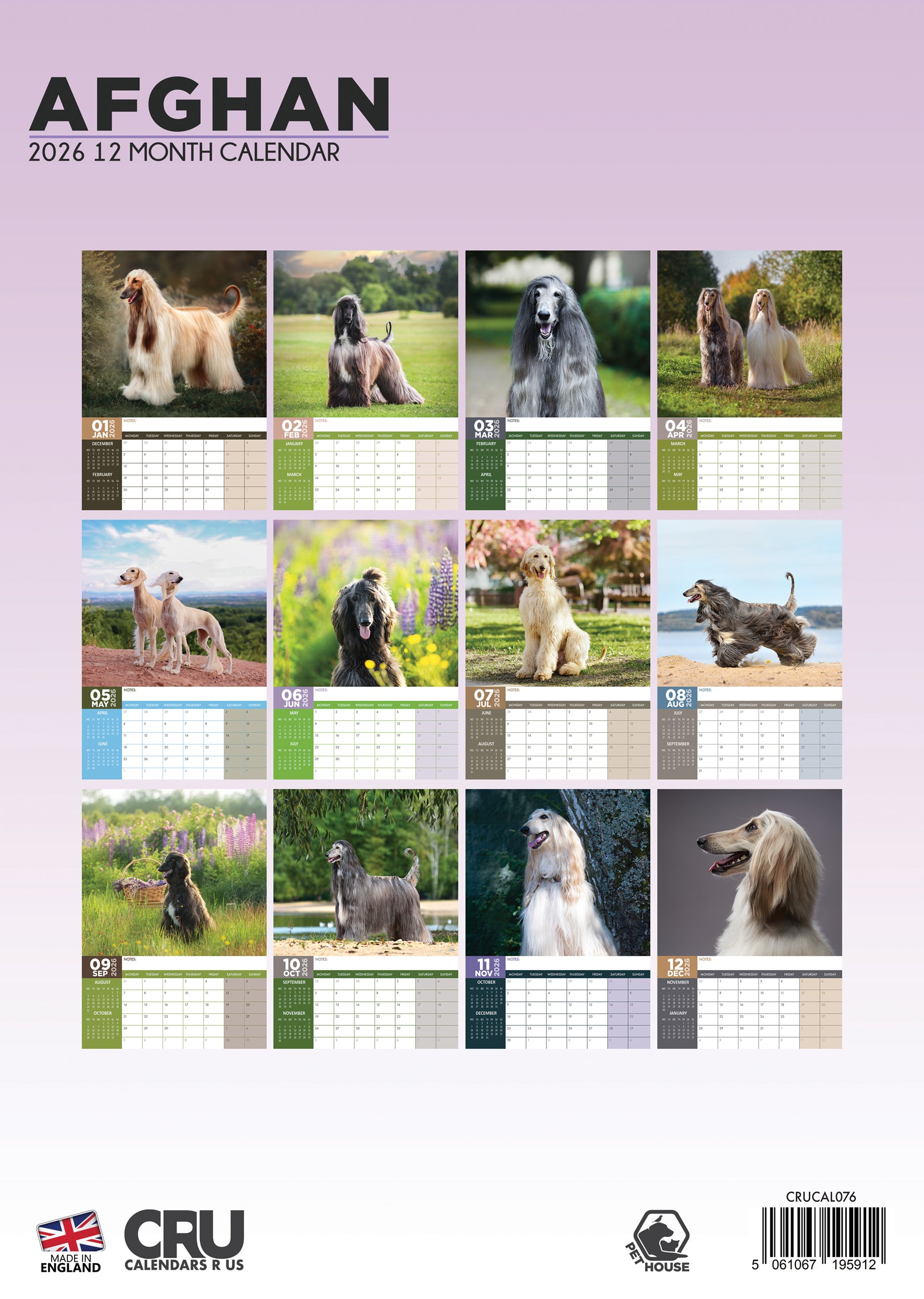 Perfect for Afghan Hound enthusiasts or as a unique gift for dog lovers, this month-to-view calendar blends visual elegance with daily practicality. Stay organized while enjoying the beauty of one of the most sophisticated dog breeds all year round.