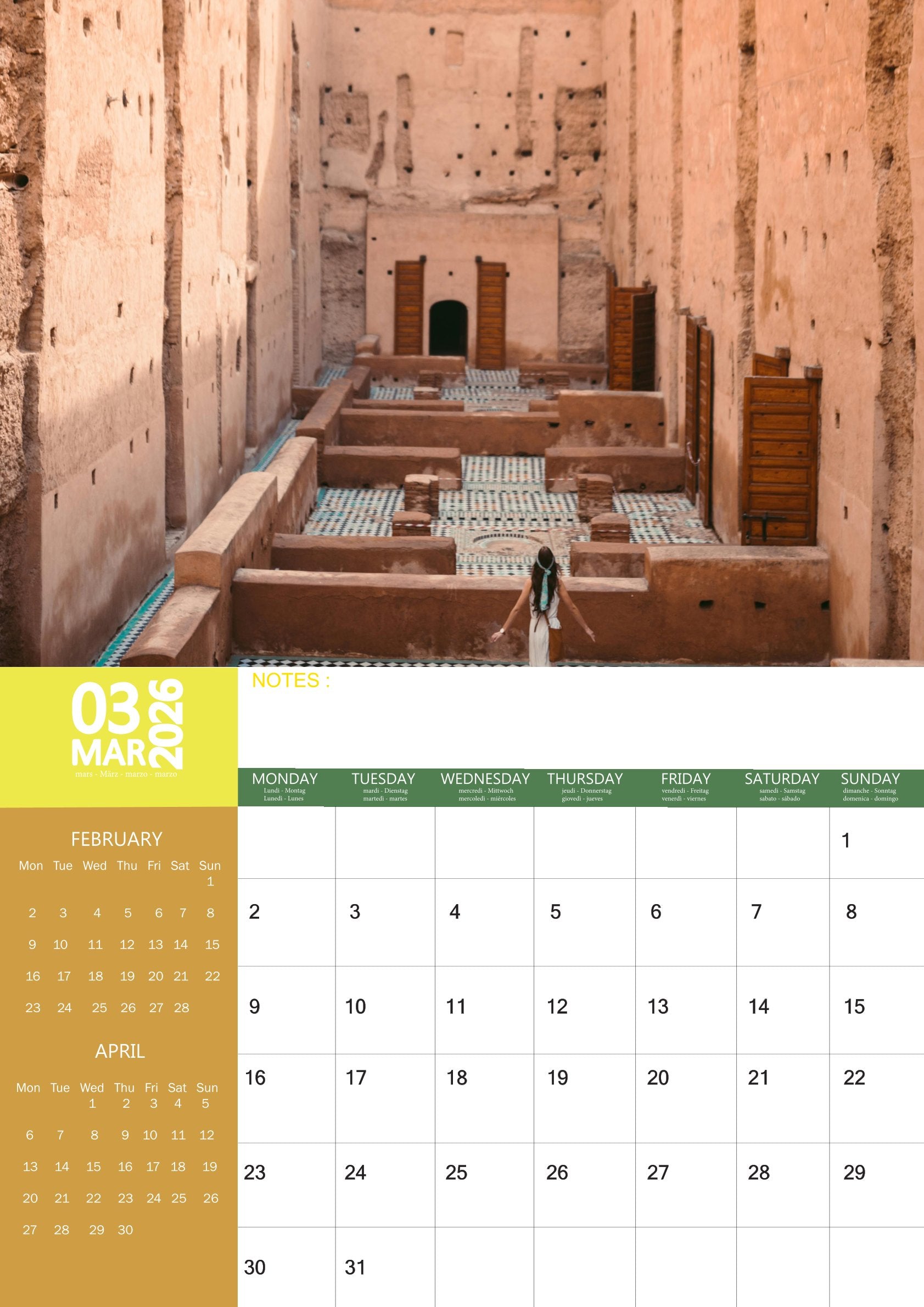 Discover the breathtaking beauty and cultural richness of a vast and diverse continent with the Africa Calendar 2026. Featuring 12 stunning images, this calendar captures the sweeping landscapes, iconic wildlife, and vibrant traditions that make Africa extraordinary. Each month showcases a different side of Africa’s natural wonders and heritage.
