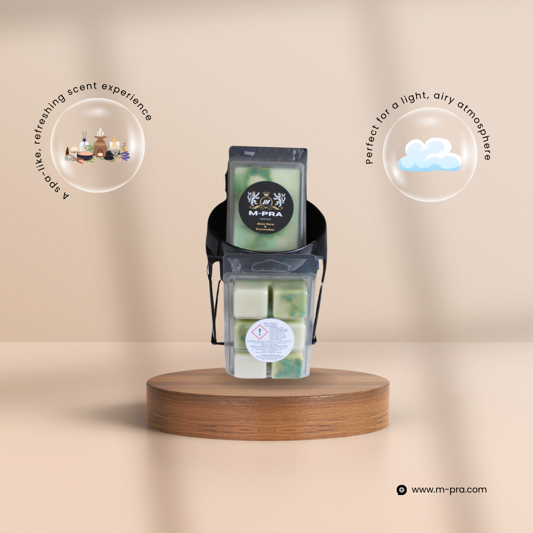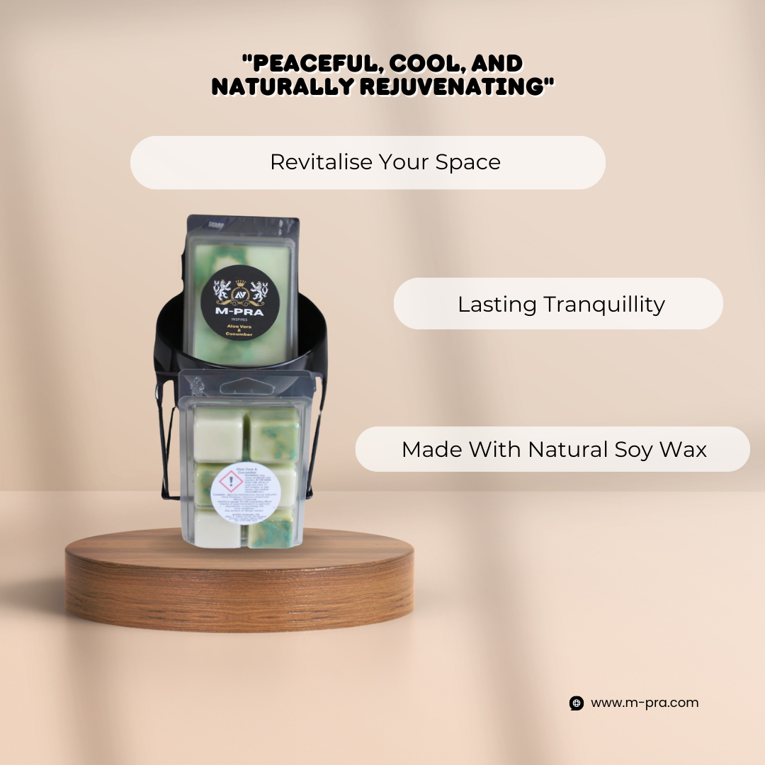 Our Aloe Vera & Cucumber Wax Melt is an uplifting spa-like scent with top notes of Aloe Vera with light crisp middle notes of cucumber that combine to recreate that classic scent.