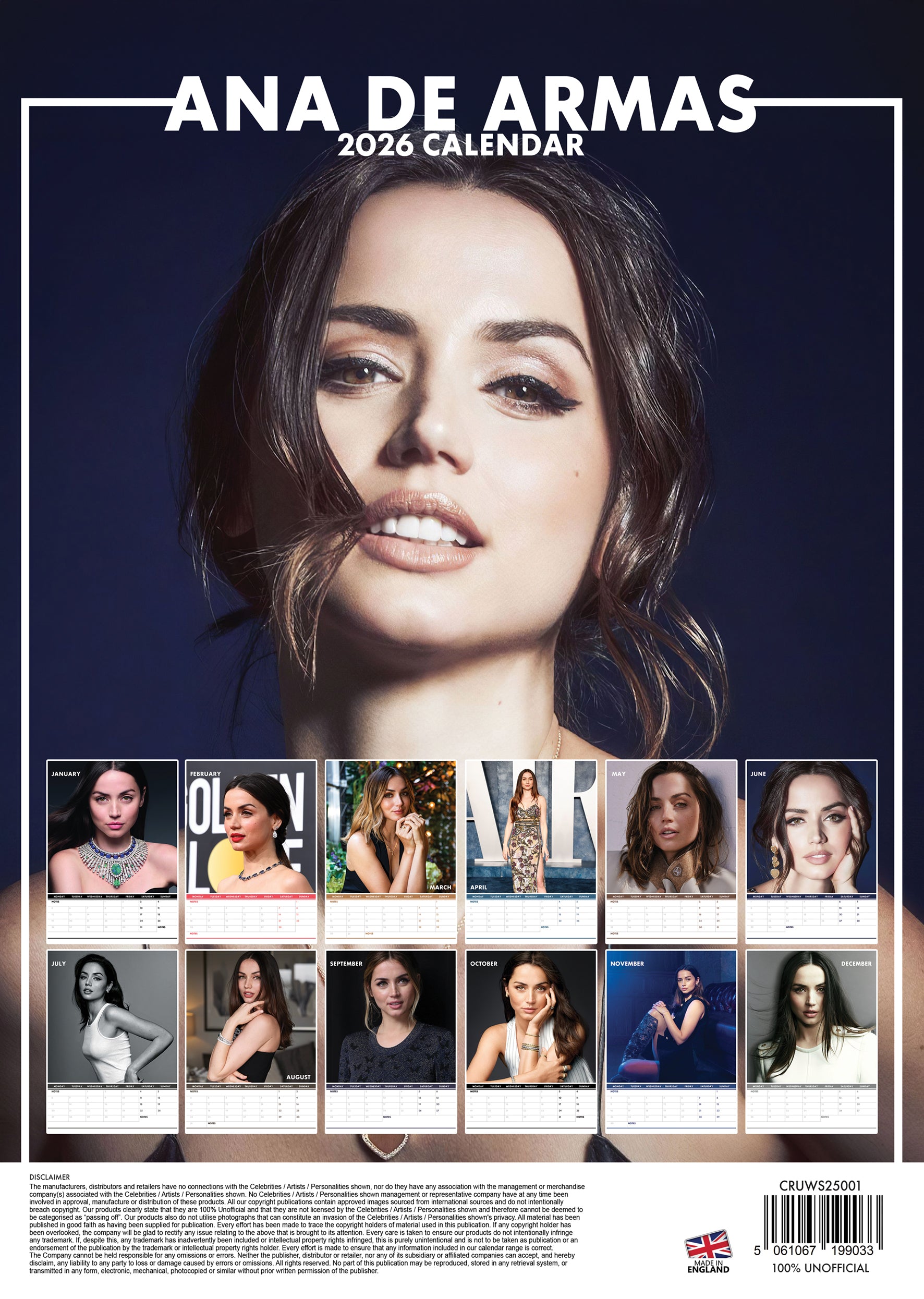 Step into 2026 with the effortless glamour and charm of Hollywood star Ana de Armas. This stunning A3 wall calendar features 12 high-quality images of Ana in a variety of iconic poses, red carpet moments, and editorial shoots. From her radiant smile to her graceful presence, each month captures a new side of this internationally admired actress.