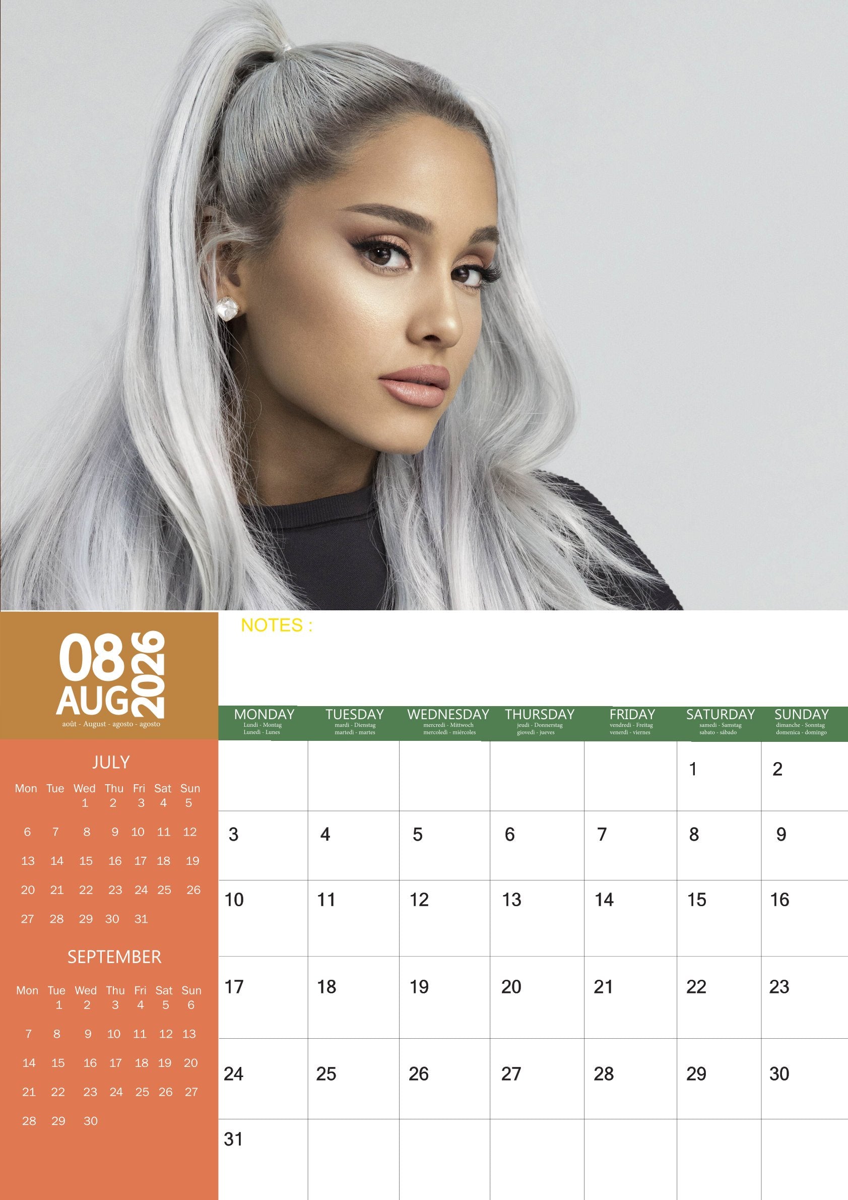 Step into the glamorous world of pop sensation Ariana Grande with the Ariana Grande Calendar 2026. Known for her powerhouse vocals, signature style, and iconic stage presence, Ariana has captured hearts around the globe. This calendar features 12 dazzling photographs that highlight her elegance, energy, and star power throughout the year.