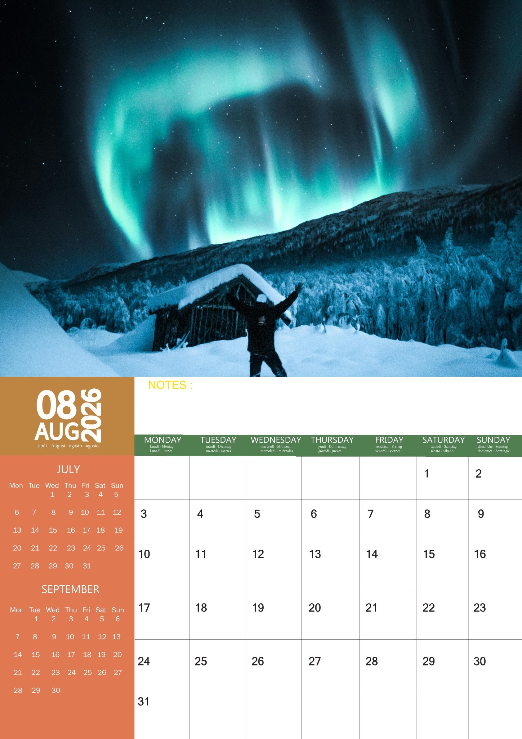 The Aurora Borealis Calendar 2026 is more than a planner—it’s a piece of art for your wall. With vibrant imagery of one of Earth’s most captivating natural wonders, it provides both beauty and functionality, making it an ideal addition to your home or office.