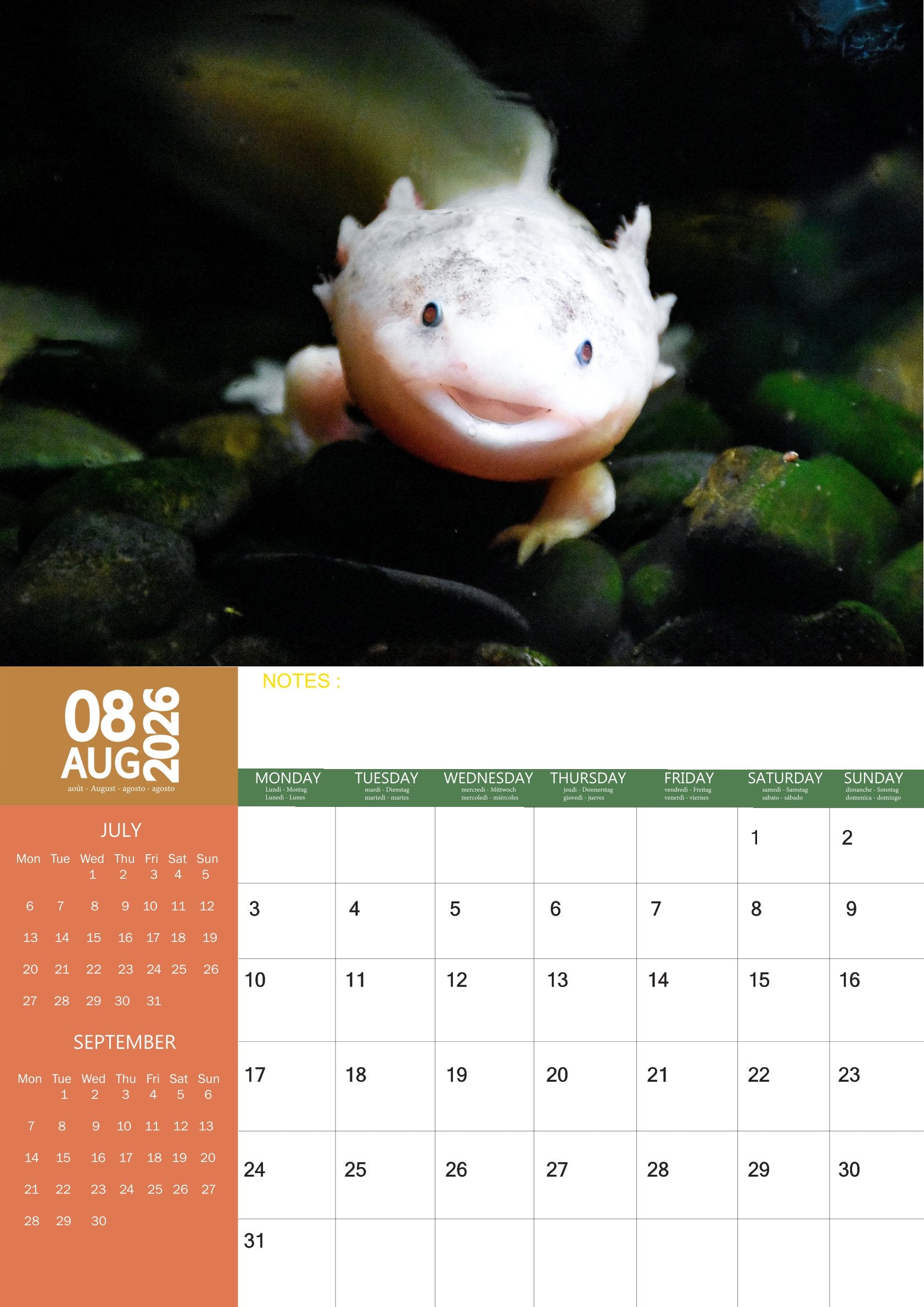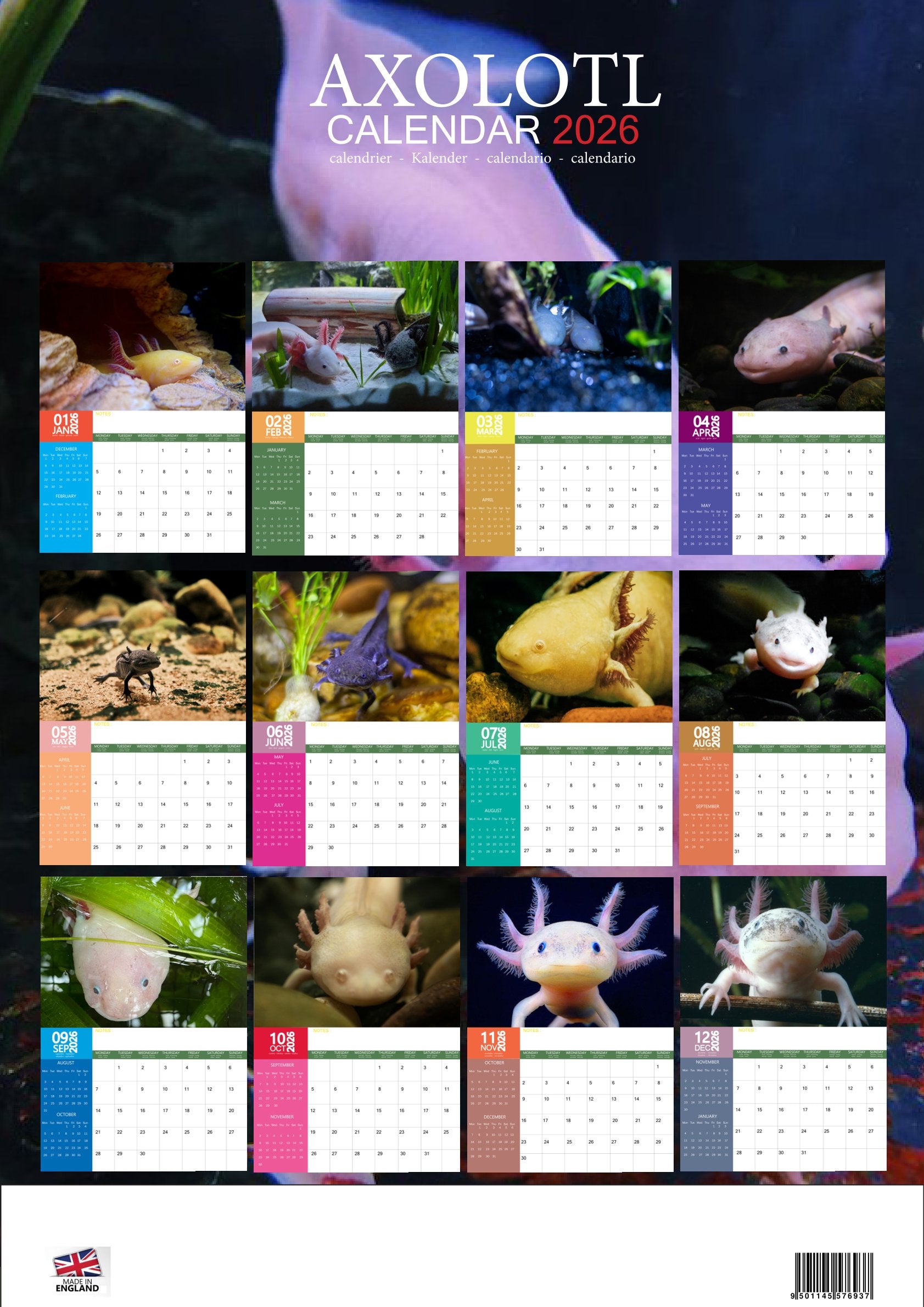 The Axolotl Calendar 2026 is more than just a calendar—it’s a year-long celebration of one of the world’s most unusual and lovable creatures. Known as the “walking fish,” axolotls bring joy with their permanently smiling faces and fascinating characteristics. This calendar is both fun and educational, making it an ideal choice for animal lovers, families, and anyone who enjoys the quirky side of nature.