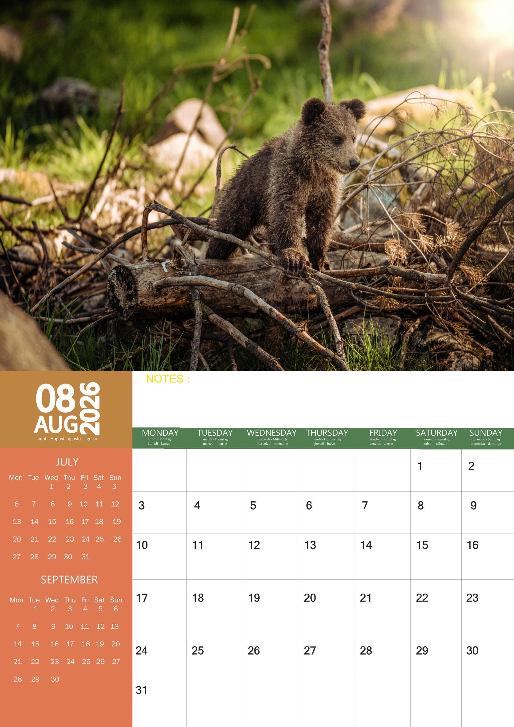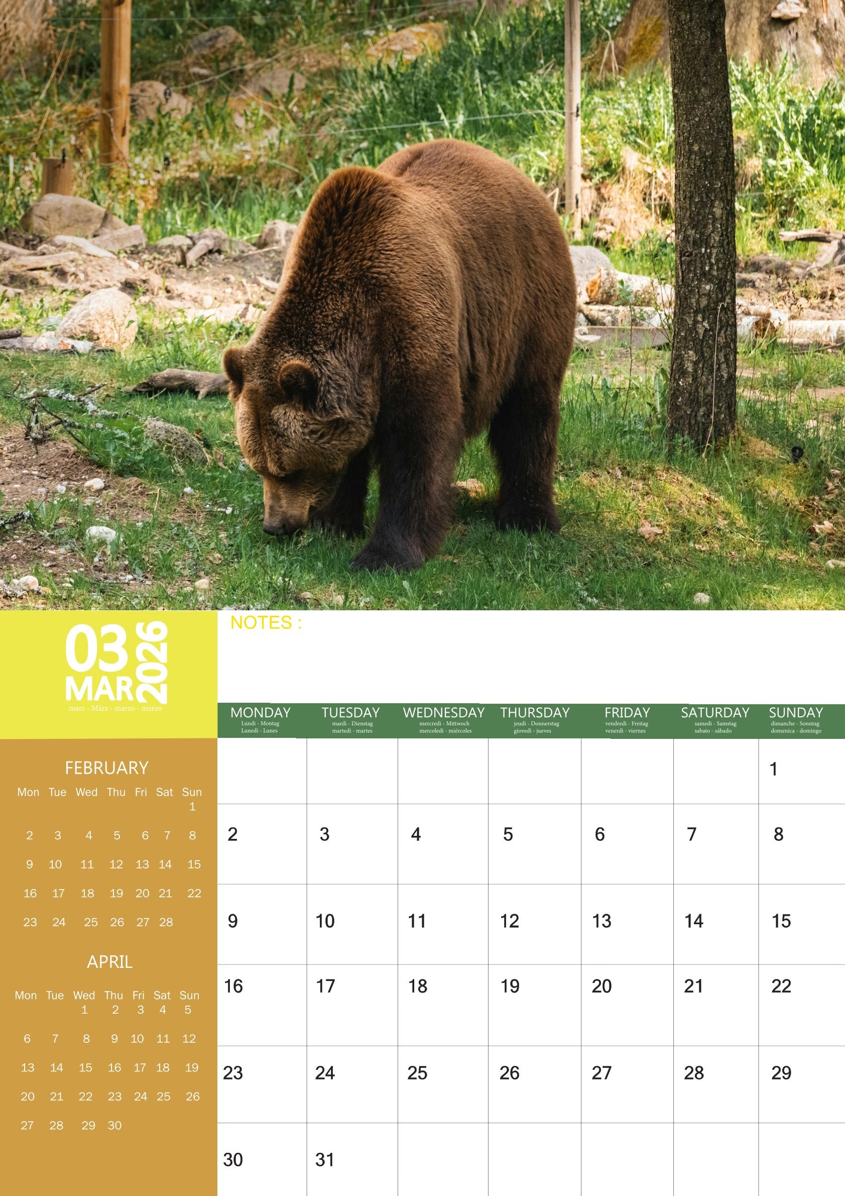 The Bear Calendar 2026 is more than just a calendar—it’s a year-long journey through the world of one of nature’s most powerful animals. Each page highlights the strength, beauty, and spirit of bears, making it a must-have for wildlife enthusiasts. Perfect for your own home or as a meaningful gift, this calendar brings the wild closer every month.