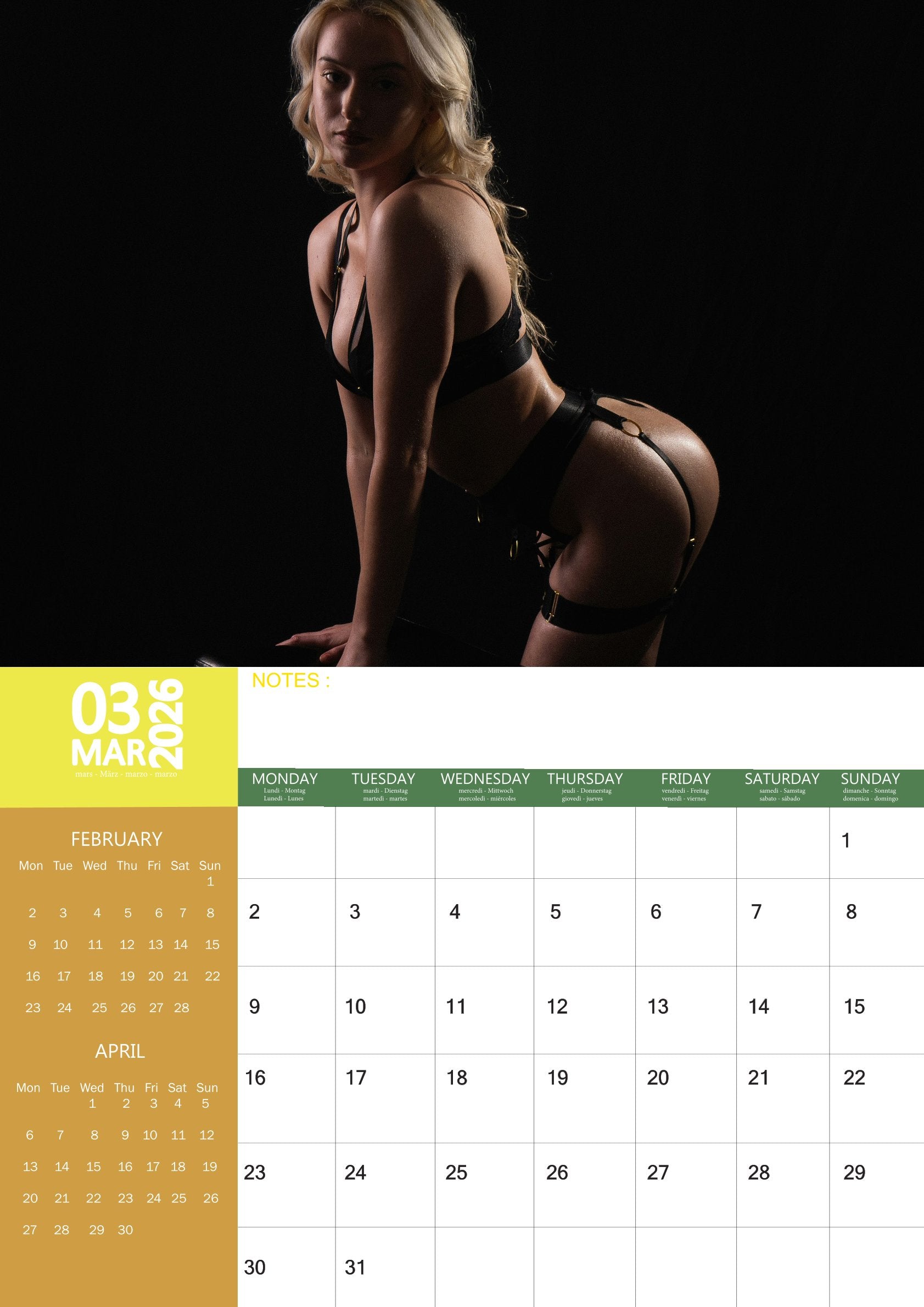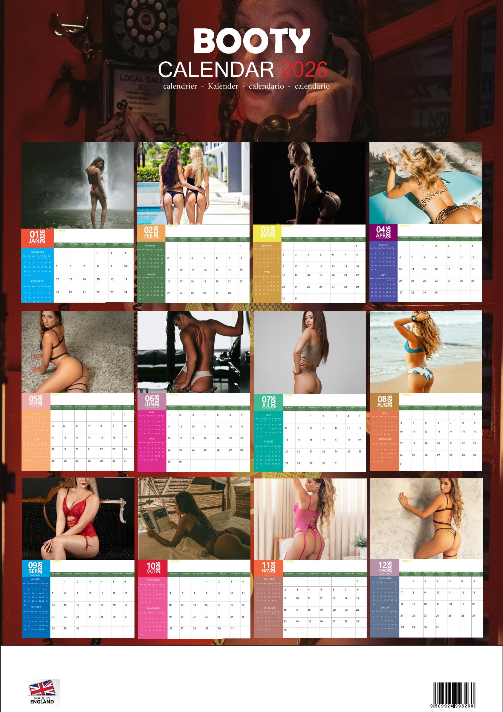 The Booty Calendar 2026 is unapologetically bold and playful. With striking images and practical date grids, it offers a mix of glamour and utility — making each month more fun and confident.