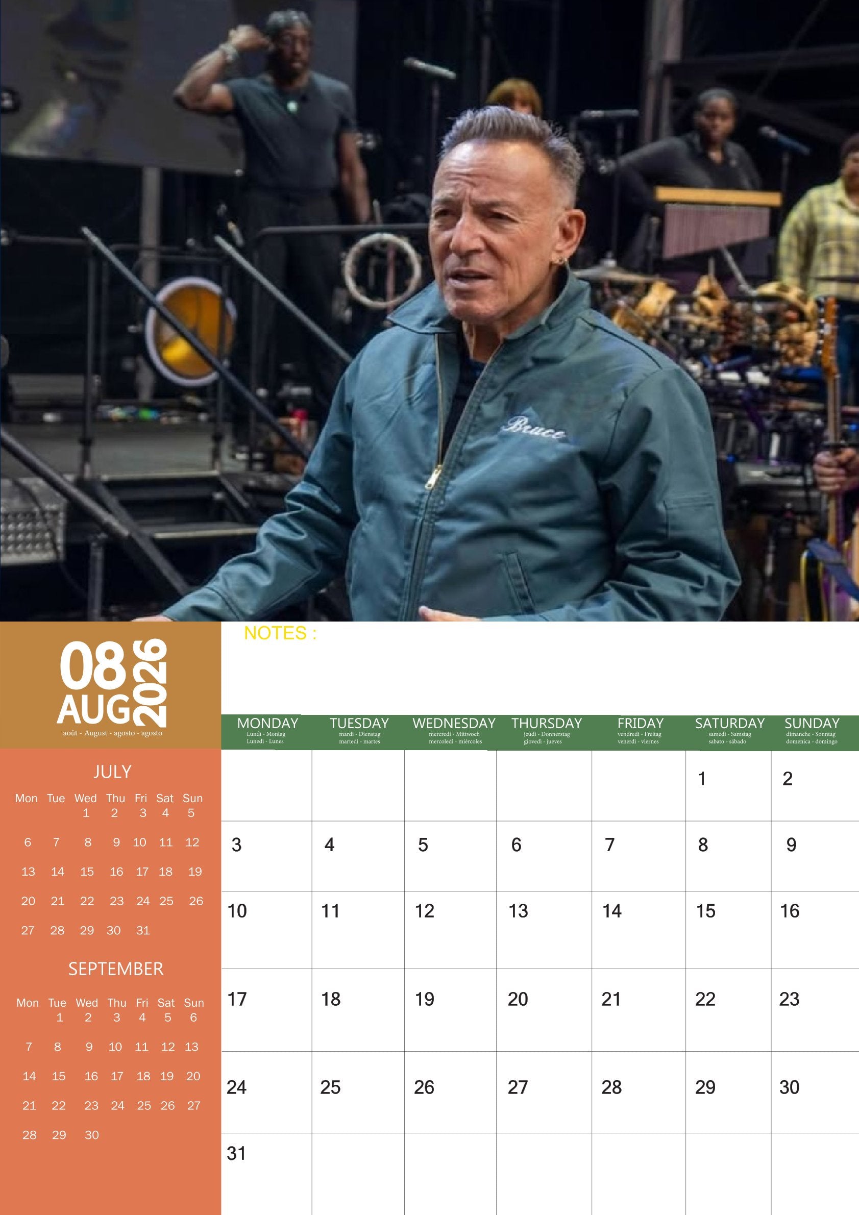 The Bruce Springsteen Calendar 2026 is not just for keeping track of dates—it’s a year-long tribute to one of the most influential and beloved musicians in rock history. Bring the energy of Springsteen into your daily life all year.
