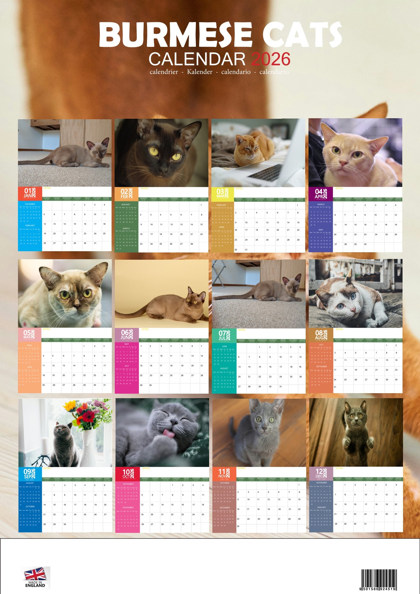 Celebrate the elegance and affectionate nature of one of the world’s most beloved cat breeds with the Burmese Cats Calendar 2026. Featuring 12 stunning images of Burmese cats, this calendar highlights their sleek coats, expressive eyes, and playful personalities. Each month captures the charm and warmth of these beautiful felines.