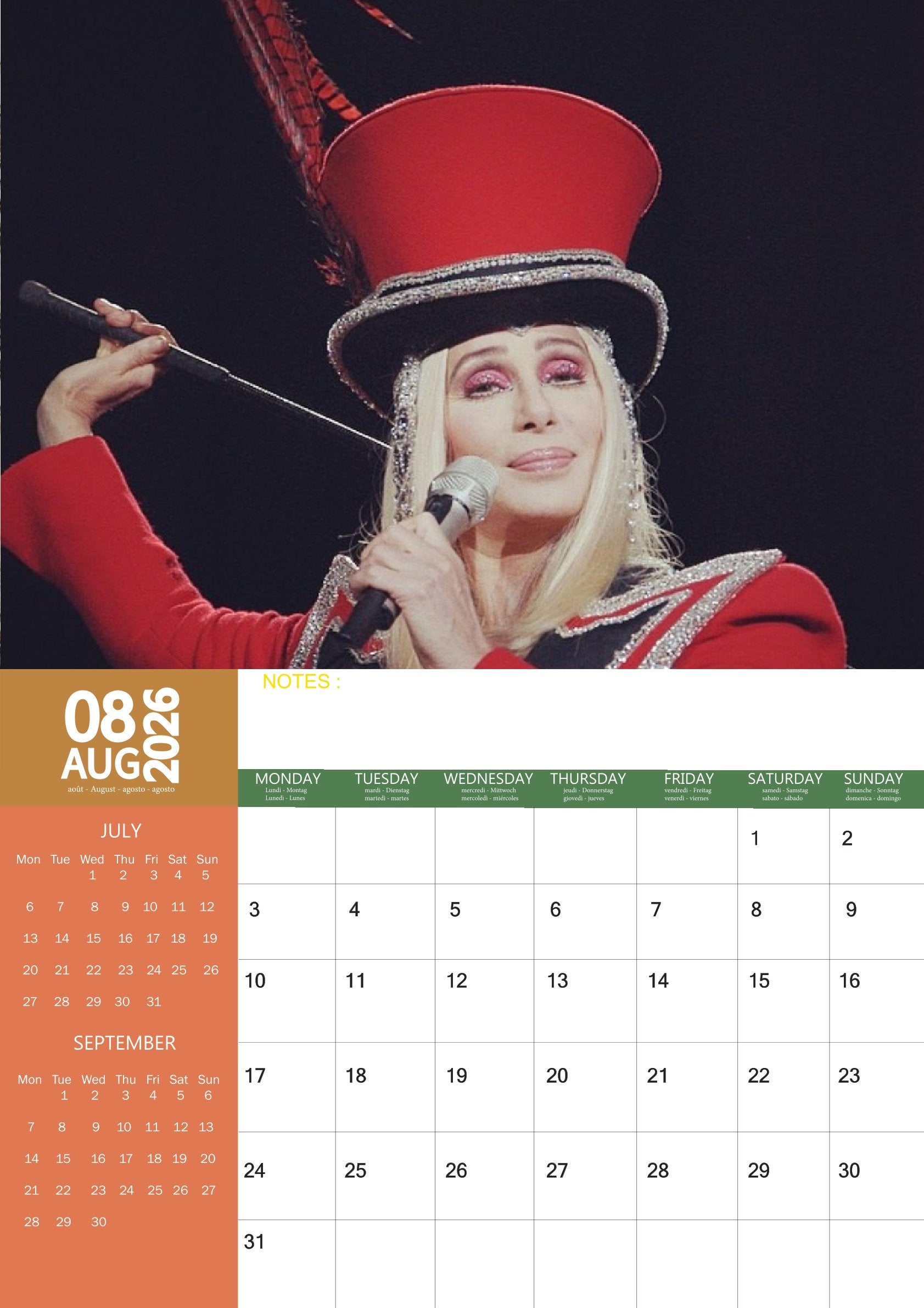 The Cher Calendar 2026 is more than just a calendar—it’s a year-long celebration of one of the most glamorous and influential performers in music history. From her powerful voice to her fearless fashion, every page reflects Cher’s legendary presence.