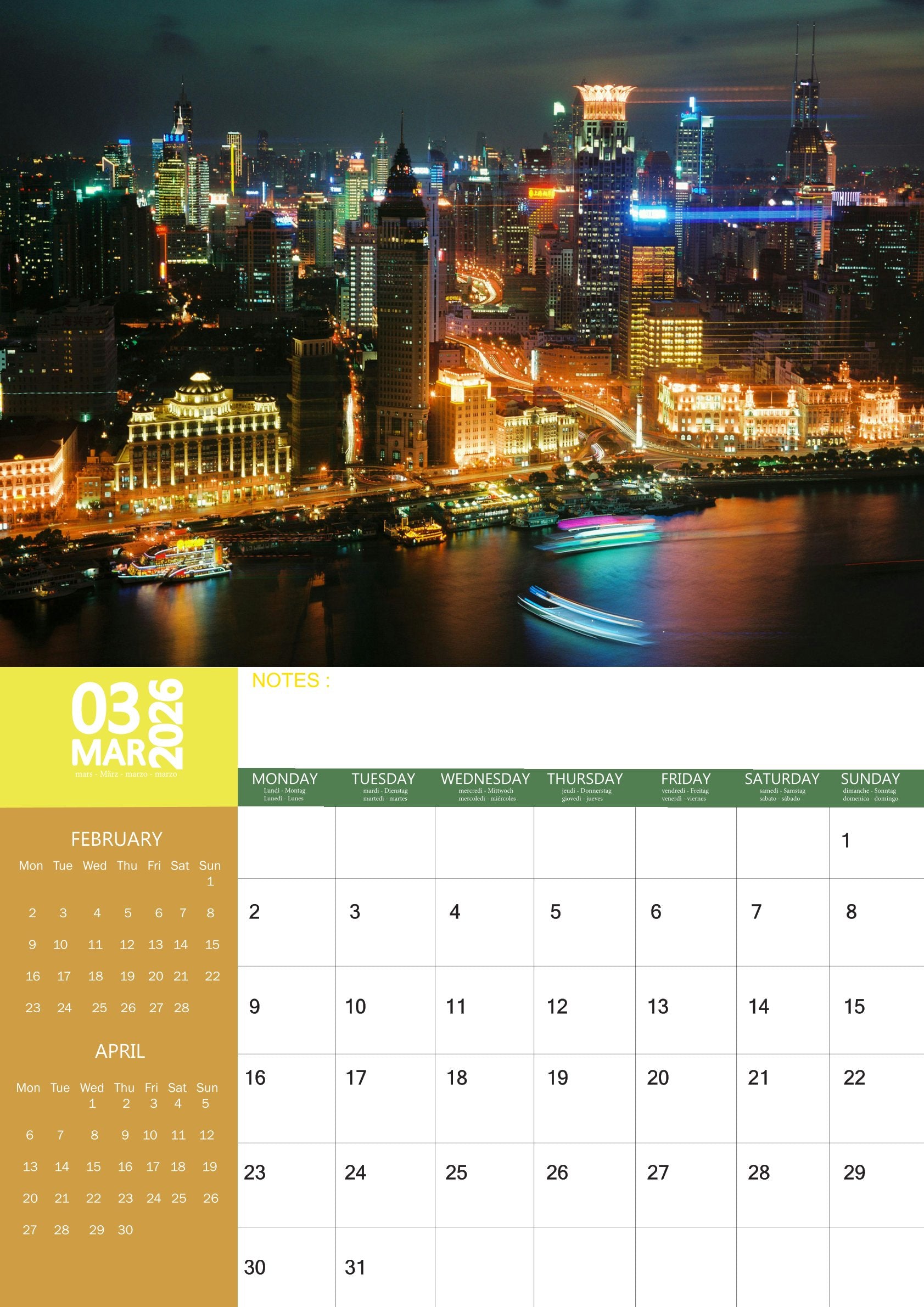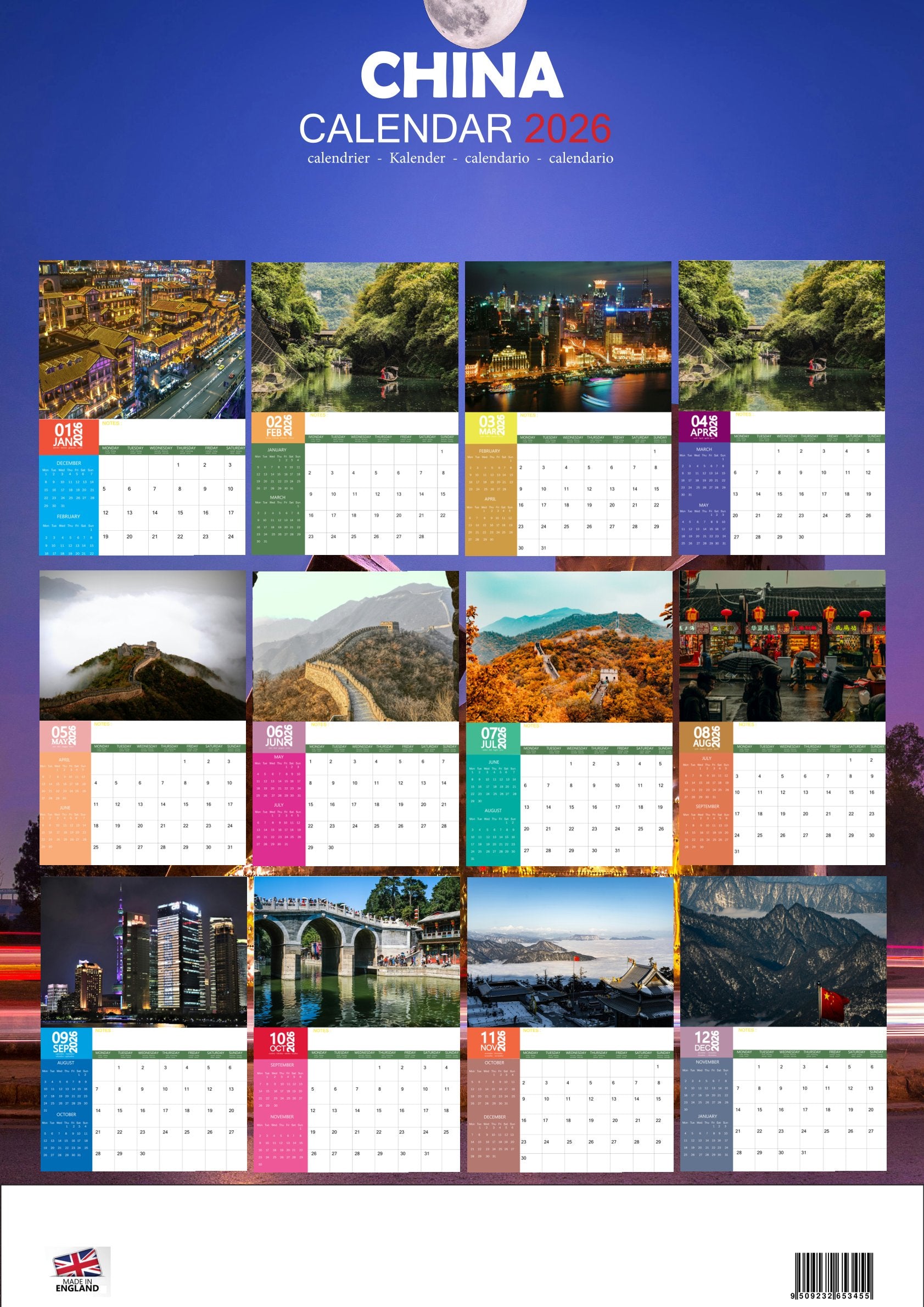 Journey through the beauty, culture, and history of the Far East with the China Calendar 2026. Featuring 12 stunning images, this calendar showcases China’s breathtaking landscapes, iconic landmarks, and rich traditions. From the Great Wall and the Forbidden City to serene mountain ranges and vibrant city skylines, each month offers a glimpse into the heart of this fascinating country.