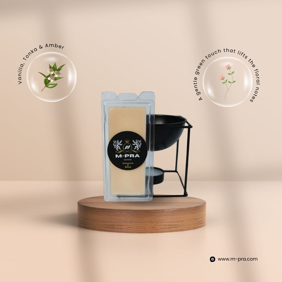 Our Coconut & Shea Wax Melt has a rich creamy aroma of coconut and shea butter with middle notes of lily, heliotrope, hawthorn and violet on a soft base of vanilla, tonka, and amber.