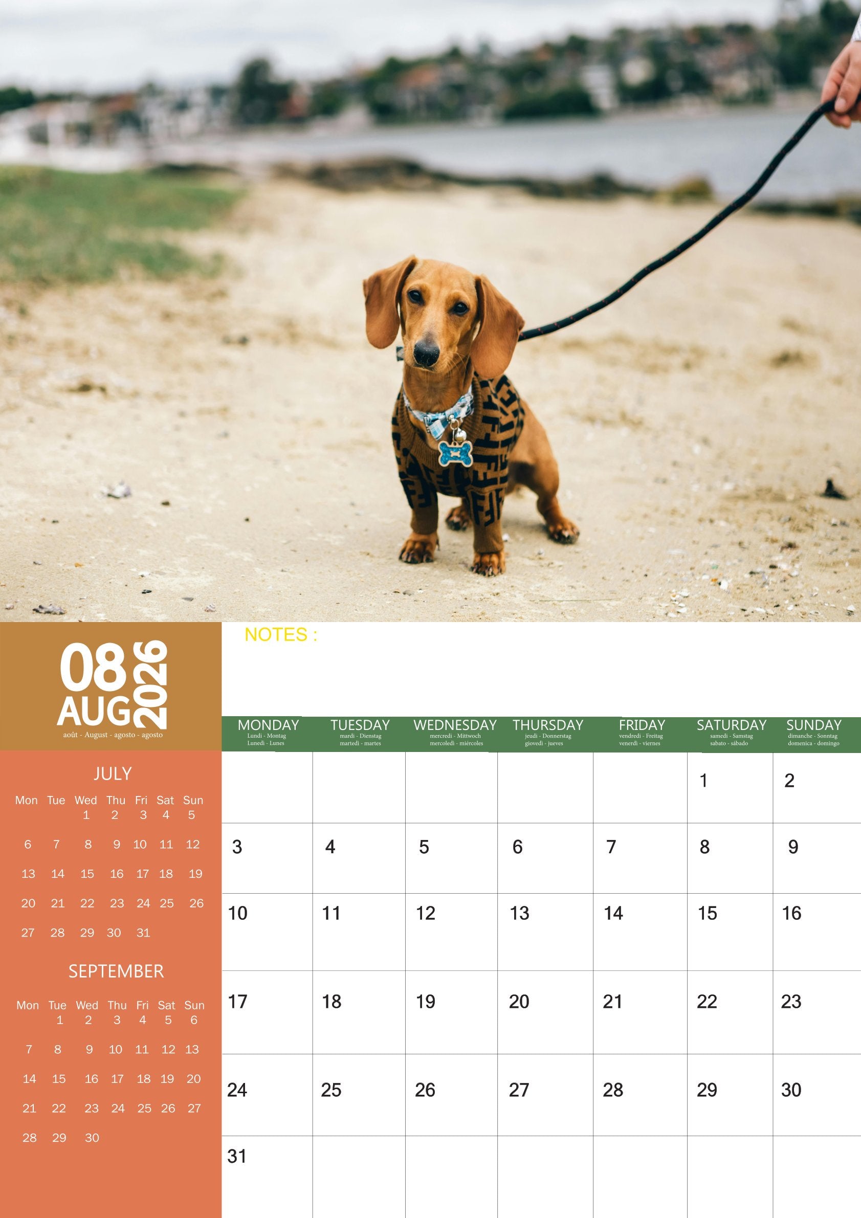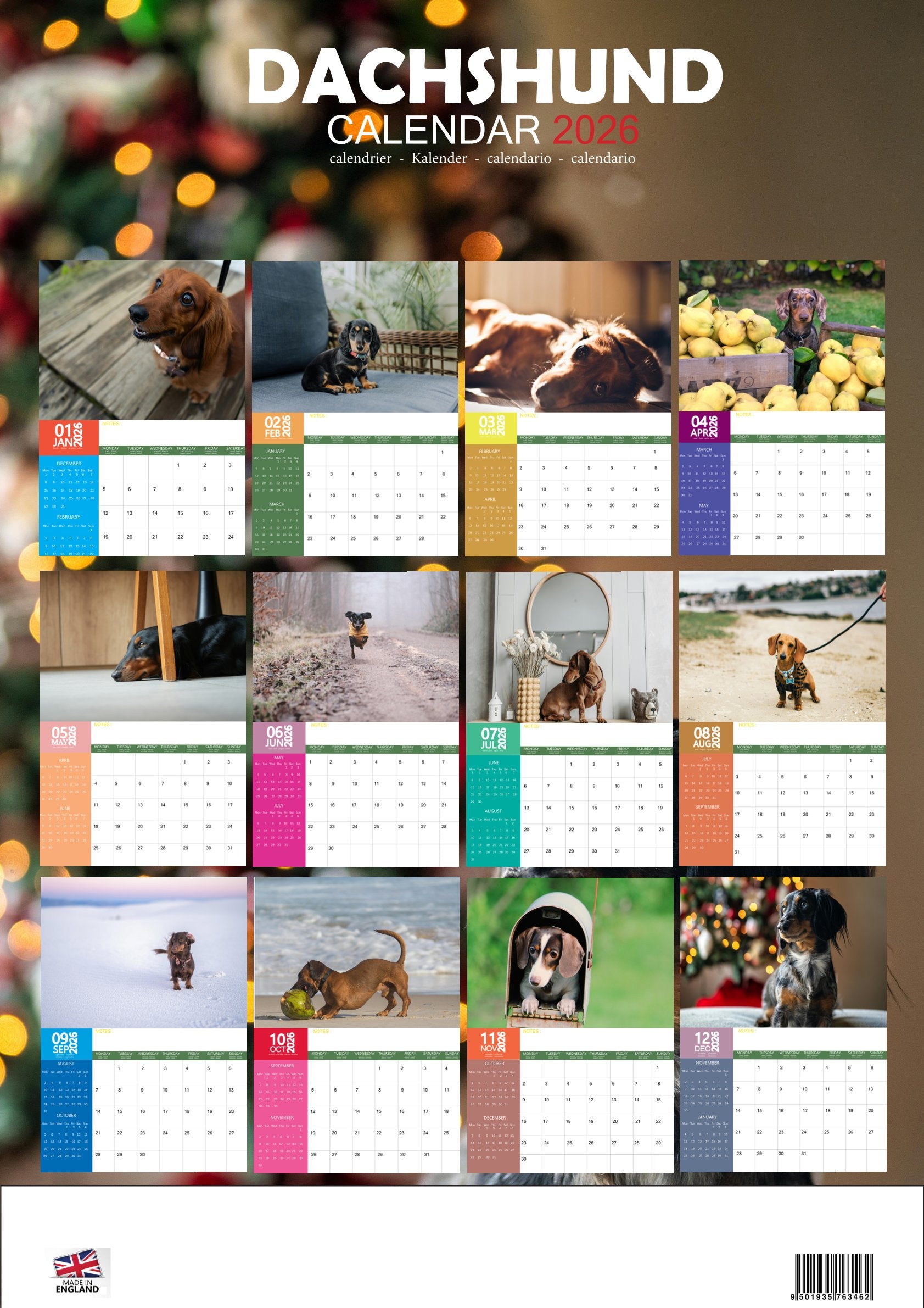 Celebrate the charming, playful, and spirited personality of the Dachshund with the Dachshund Calendar 2026. Featuring 12 delightful photographs, this calendar showcases the breed’s long body, short legs, and expressive face. Each month captures the Dachshund’s loyalty, curiosity, and affectionate nature, making it a perfect calendar for dog lovers.