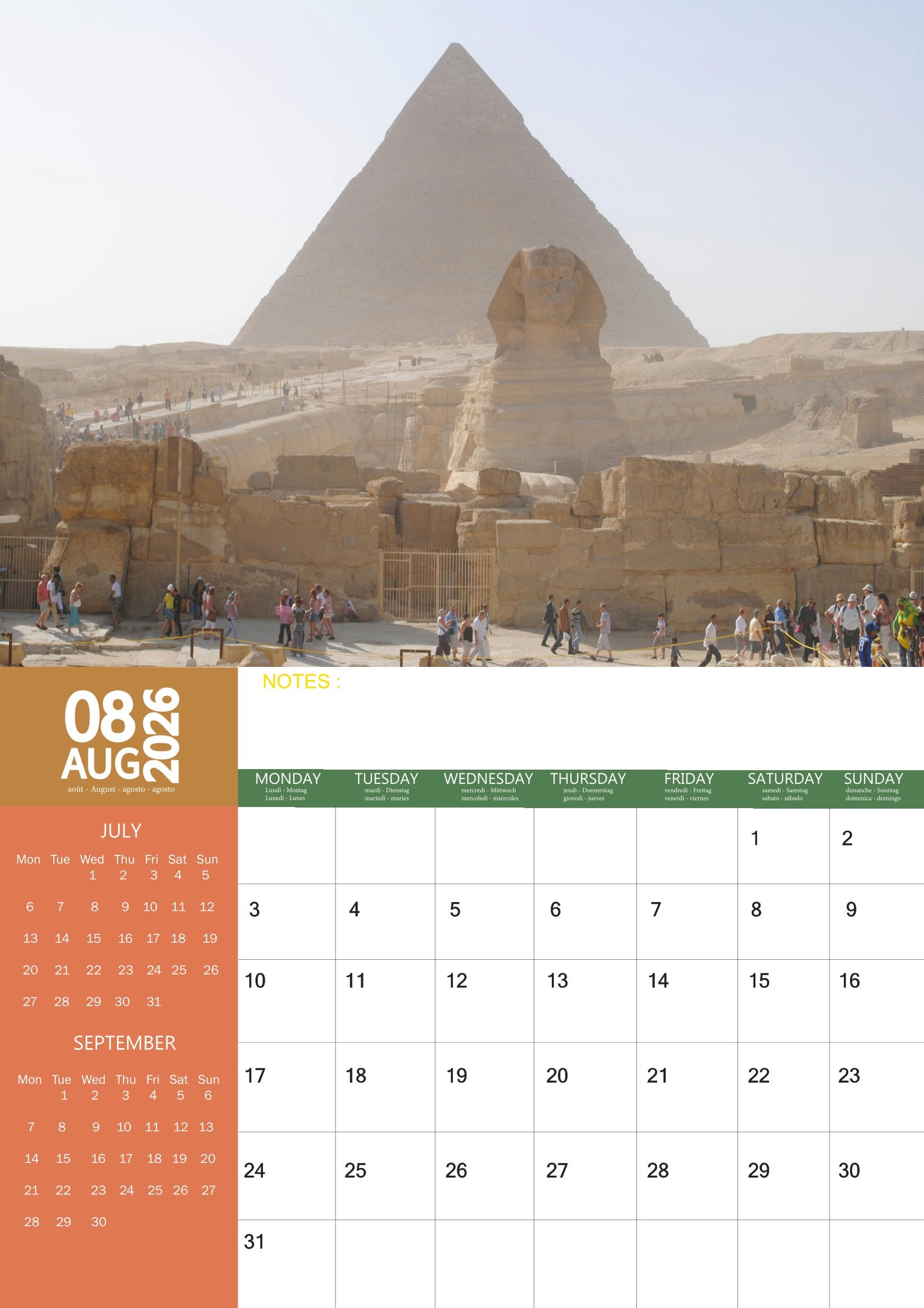 Step into the land of ancient wonders and timeless beauty with the Egypt Calendar 2026. Featuring 12 breathtaking images, this calendar captures the magic of Egypt—from the iconic Pyramids of Giza and the Sphinx to the serene Nile River, golden deserts, and vibrant cultural scenes. Each month offers a glimpse into the country’s fascinating history and captivating landscapes.