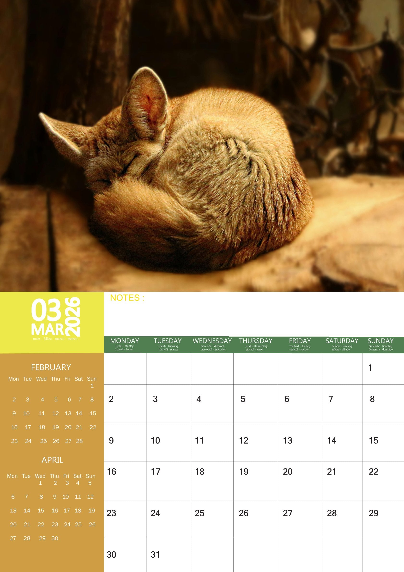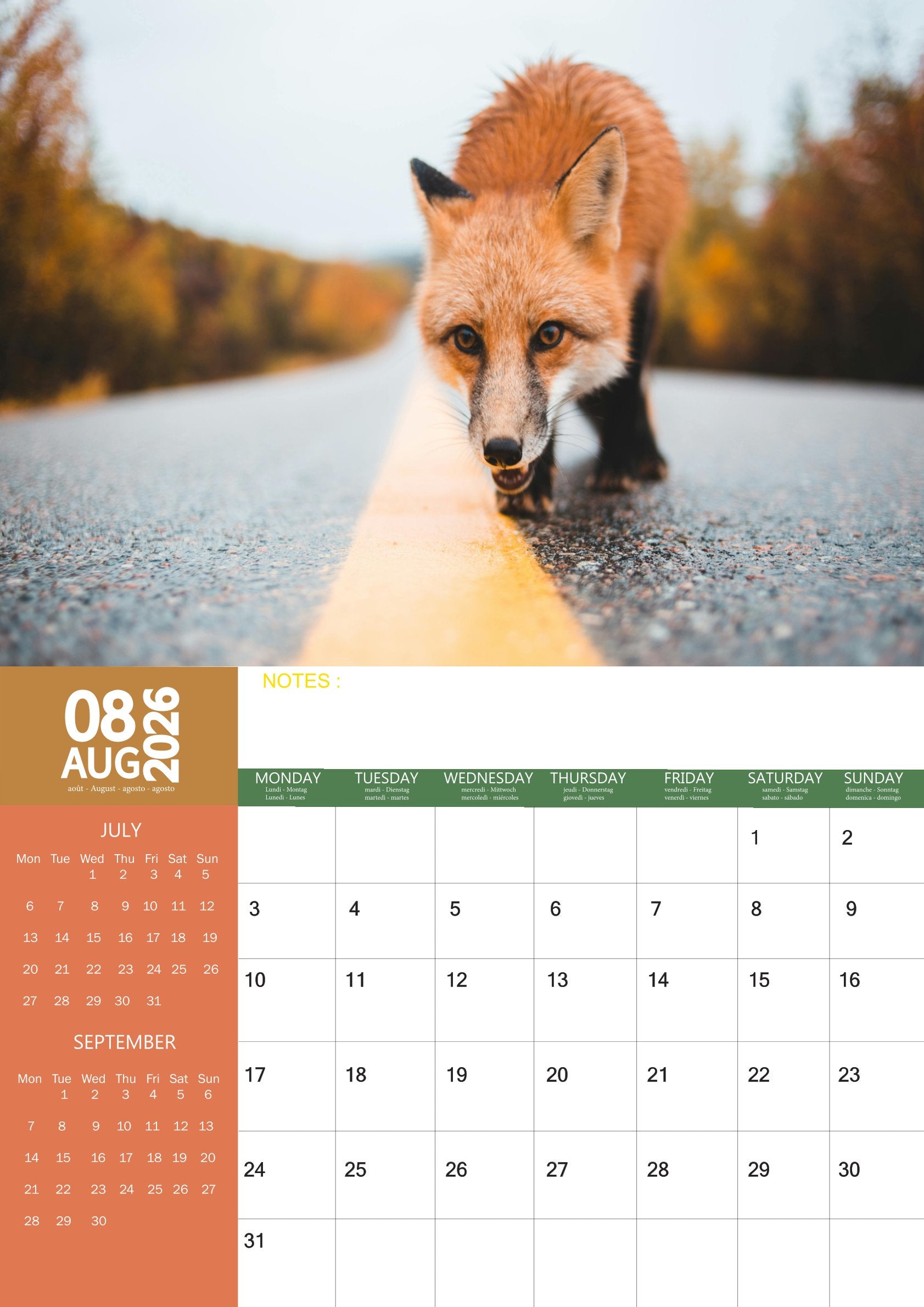 The Fox Calendar 2026 is more than a date-keeper—it’s a tribute to the intelligence, charm, and resilience of foxes. Known for their adaptability and striking presence, foxes bring a sense of wonder to every season. With its stunning imagery and practical design, this calendar is perfect for anyone who wants to bring a touch of the wild into their home.