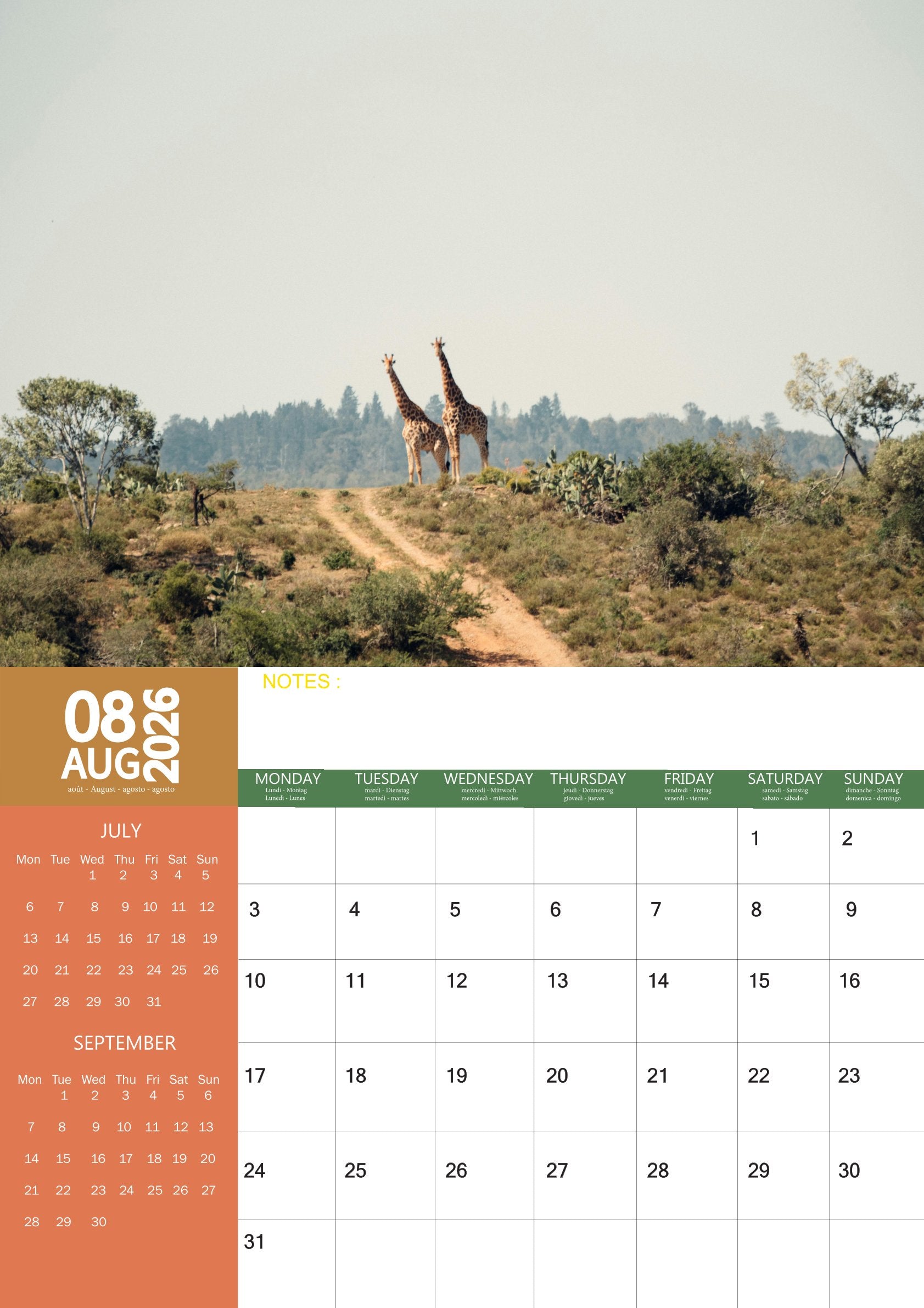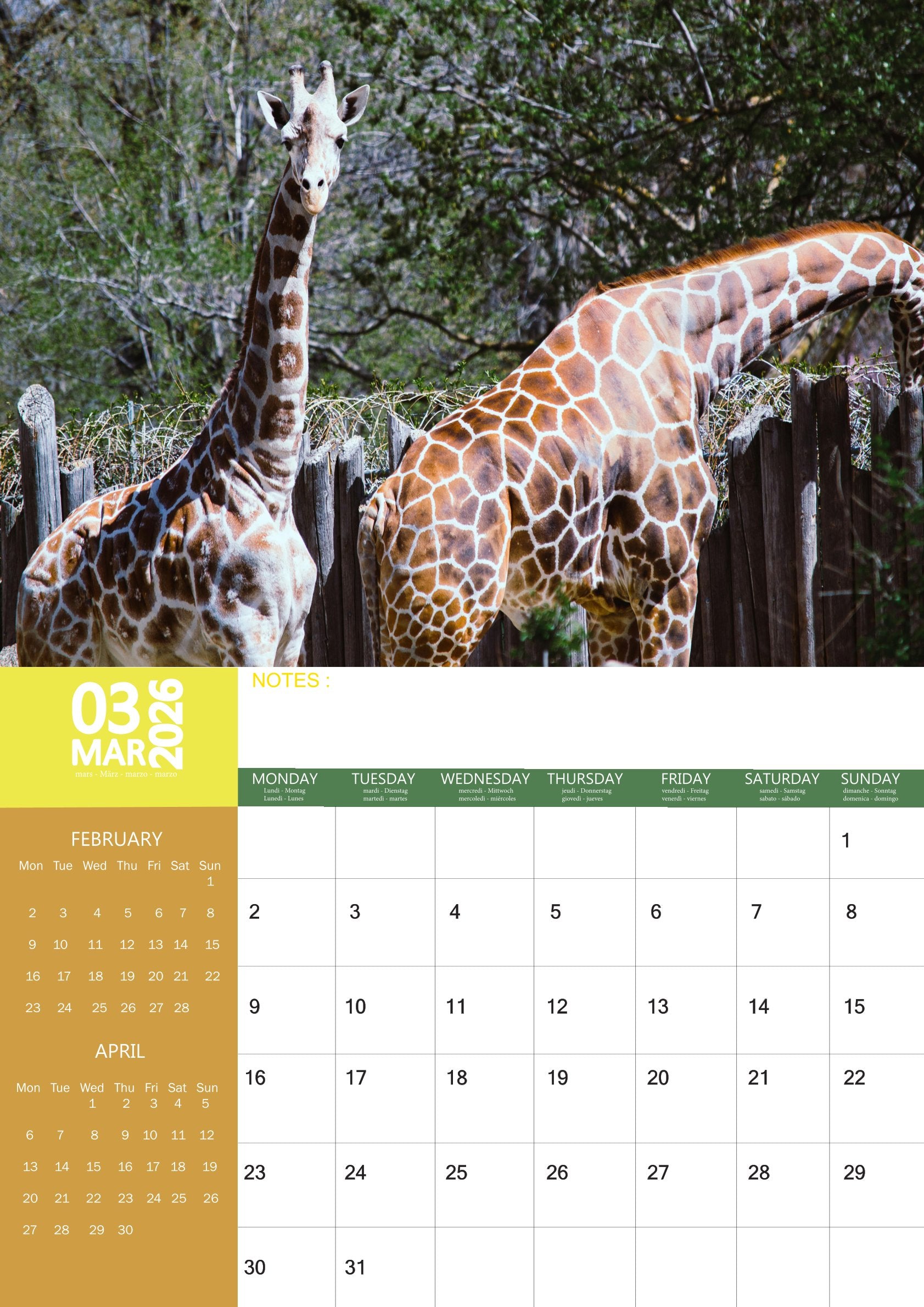The Giraffe Calendar 2026 is more than just a way to track your days—it’s a window into the beauty of the African savannah. From their towering presence to their gentle nature, giraffes bring a sense of wonder and peace with every image. Ideal for decorating your home or office, this calendar is a year-long celebration of one of the world’s most iconic animals.