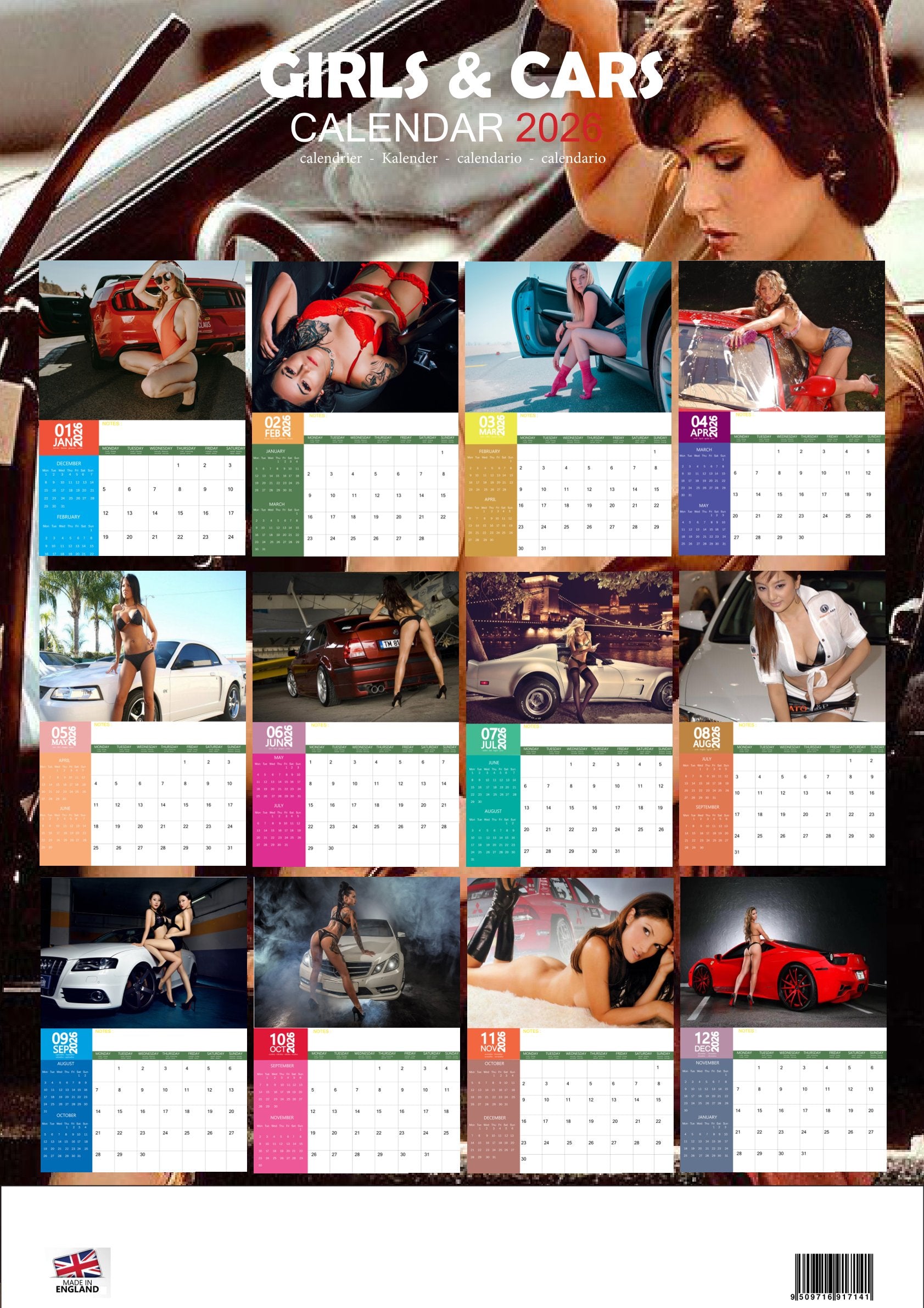 Rev up your year with the Girls & Cars Calendar 2026 — a high-octane blend of beauty and horsepower. Featuring 12 glossy images of stunning models paired with powerful cars, this calendar is the ultimate tribute to speed, style, and allure. Each month delivers a striking combination of glamour and automotive excellence, guaranteed to keep your walls looking fast and fabulous.