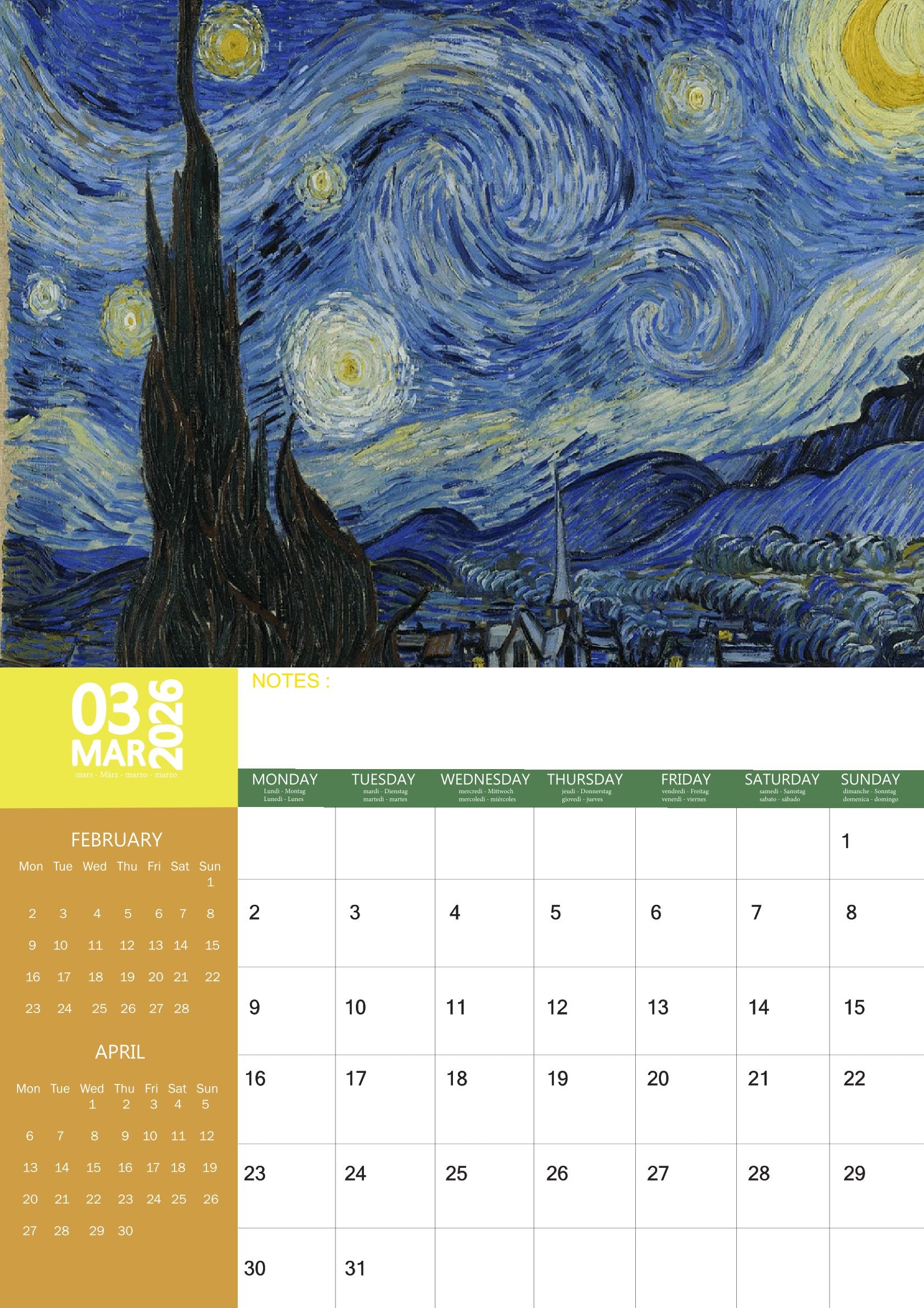 The Impressionist Calendar 2026 is more than a practical organiser—it’s a gallery of inspiration. With famous artworks and a functional layout, it adds colour, culture, and elegance to your home or office throughout the year.