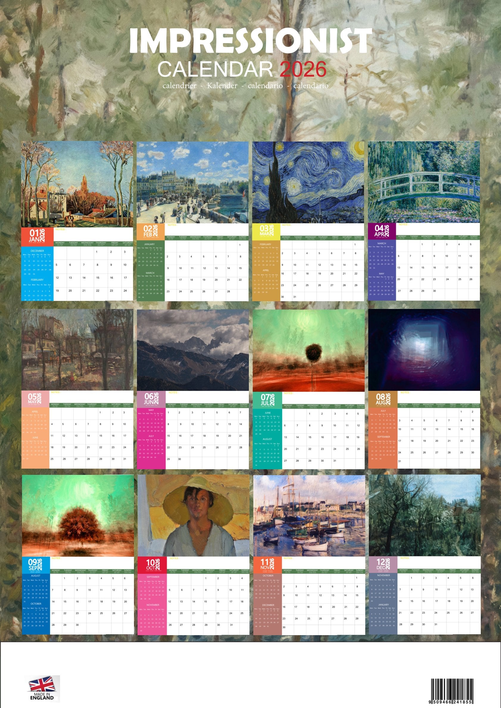 Experience the timeless beauty of art with the Impressionist Calendar 2026. Featuring 12 exquisite reproductions of impressionist masterpieces, this calendar brings the soft brushstrokes, vibrant colours, and evocative light of this celebrated art movement into your daily life. From serene landscapes to elegant portraits, each month offers a new masterpiece to enjoy.