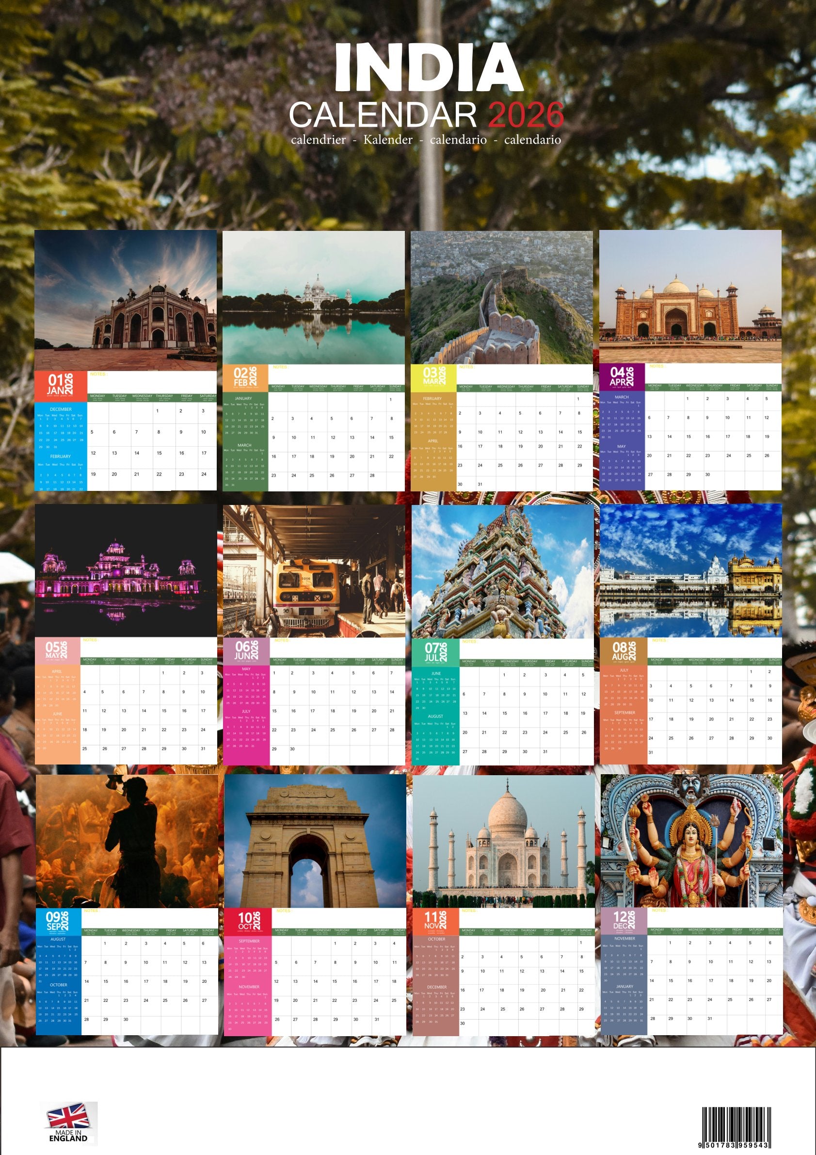 Celebrate the colour, culture, and beauty of one of the world’s most vibrant countries with the India Calendar 2026. Featuring 12 stunning images, this calendar showcases the diverse landscapes, iconic landmarks, and rich traditions of India. From the Taj Mahal and Jaipur’s palaces to Kerala’s backwaters, Himalayan peaks, and bustling festivals, each month offers a glimpse into the heart of this extraordinary nation.