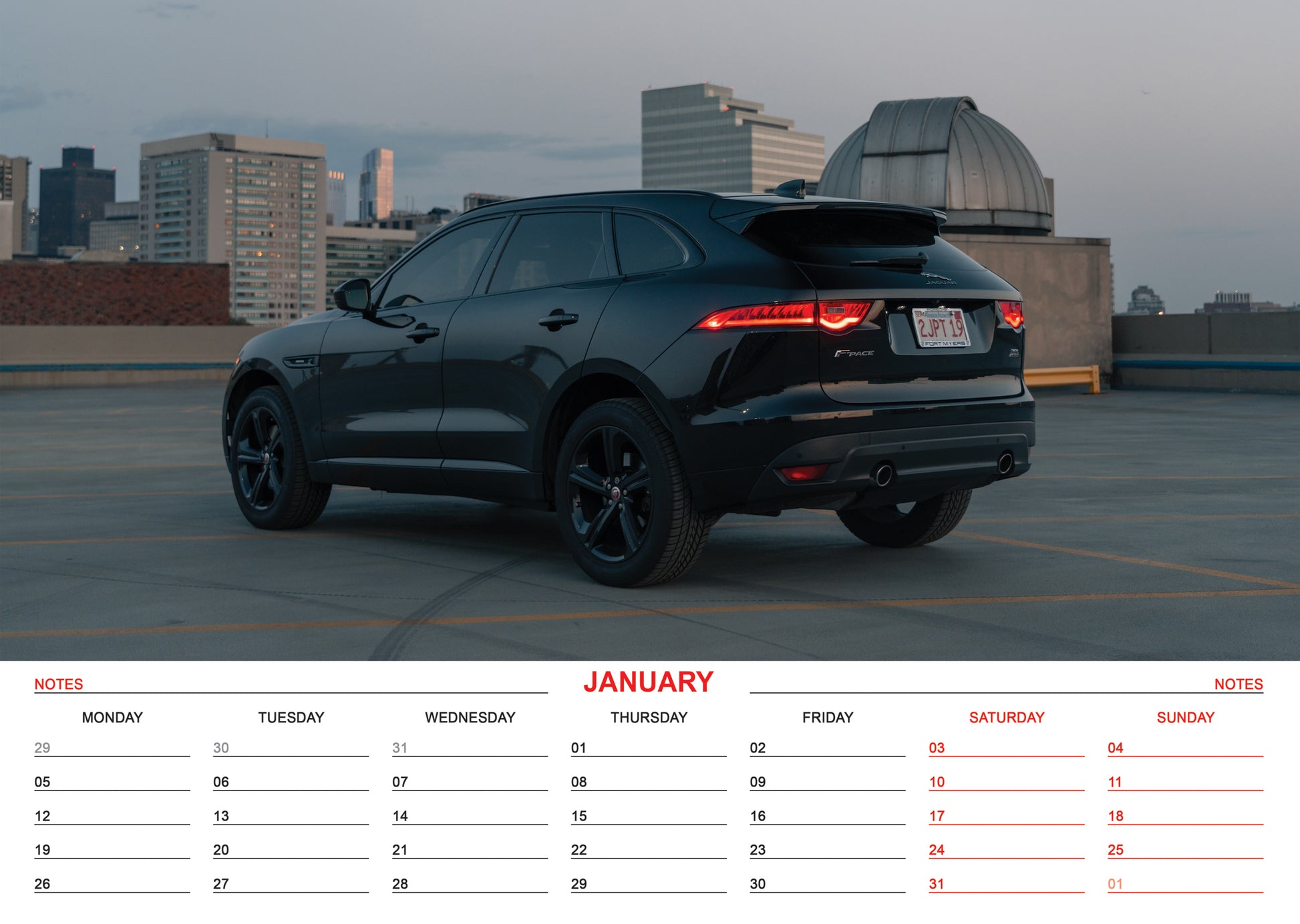Each month features a high-quality image of a stunning Jaguar, capturing the power, prestige, and precision that define this world-renowned brand.