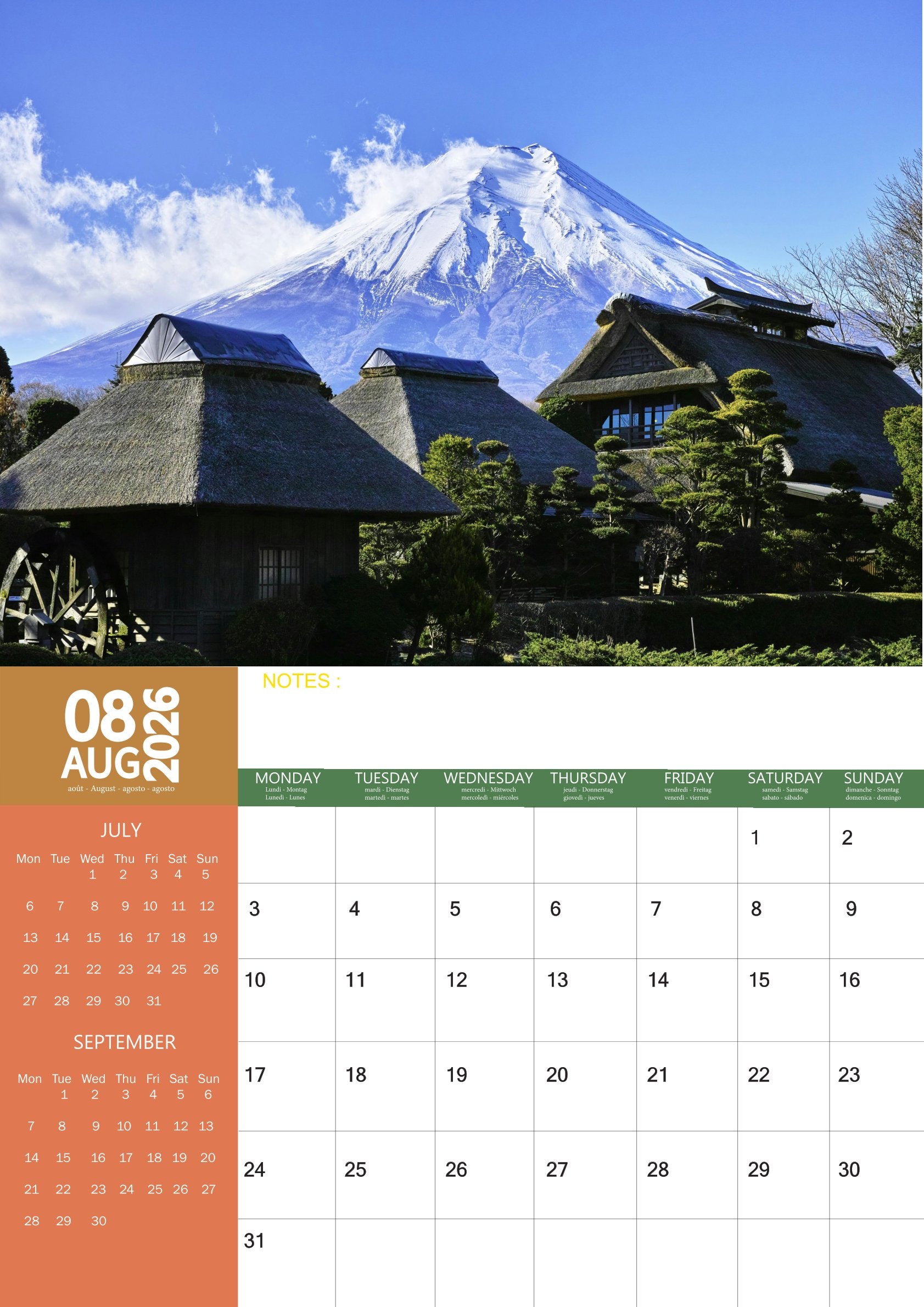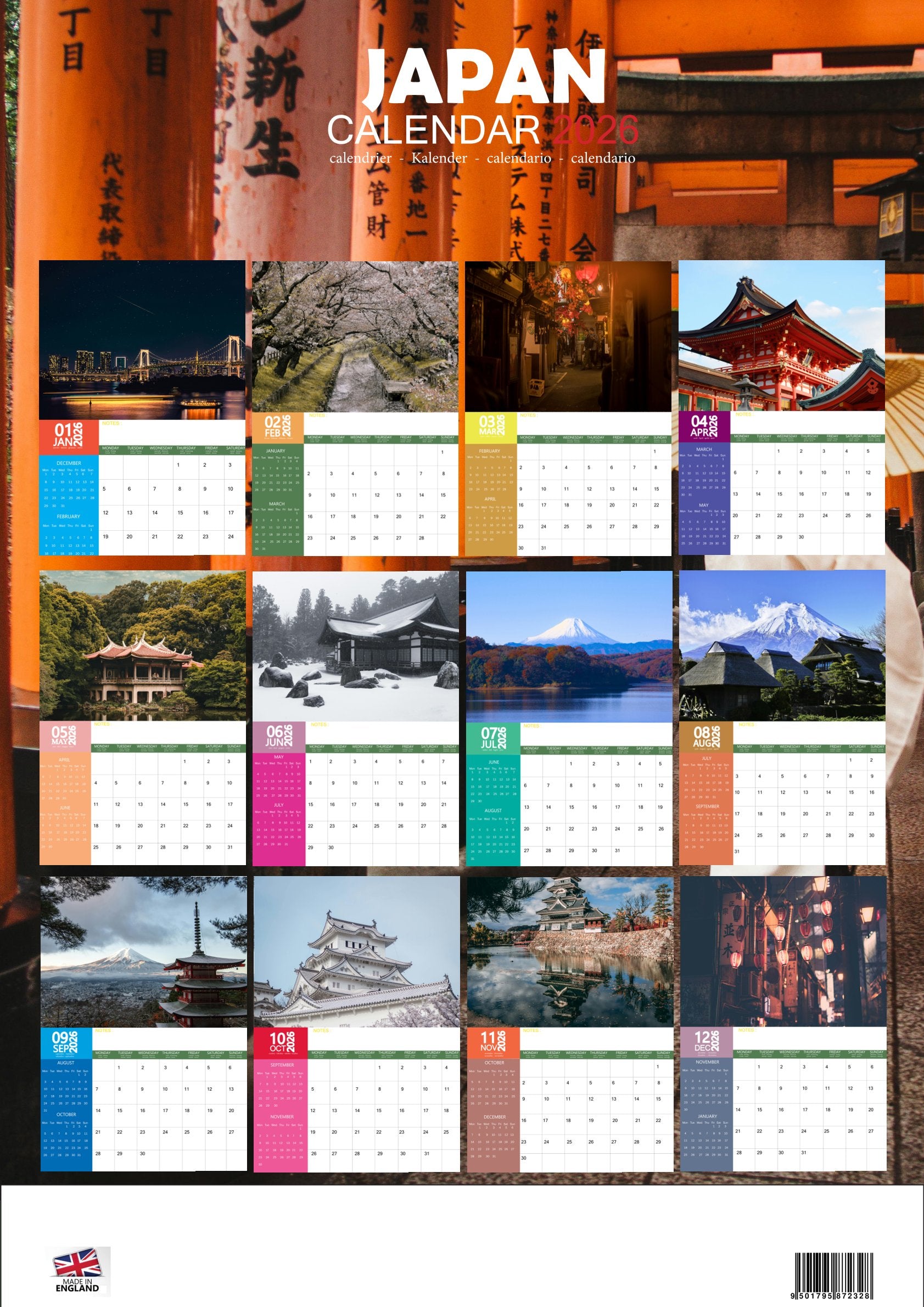 Discover the elegance, tradition, and beauty of the Land of the Rising Sun with the Japan Calendar 2026. Featuring 12 stunning images, this calendar captures Japan’s breathtaking cherry blossoms, serene temples, vibrant cities, and majestic landscapes. From Mount Fuji and Kyoto’s shrines to Tokyo’s neon skyline and peaceful Zen gardens, each month transports you to the heart of Japan’s timeless charm.