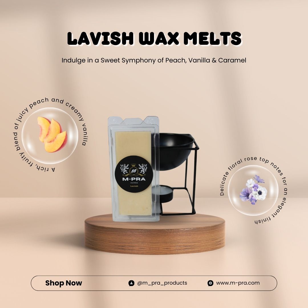 This popular Lavish Wax Melt scent has a rich peach scent infused with creamy vanilla and top notes of rose and caramel.