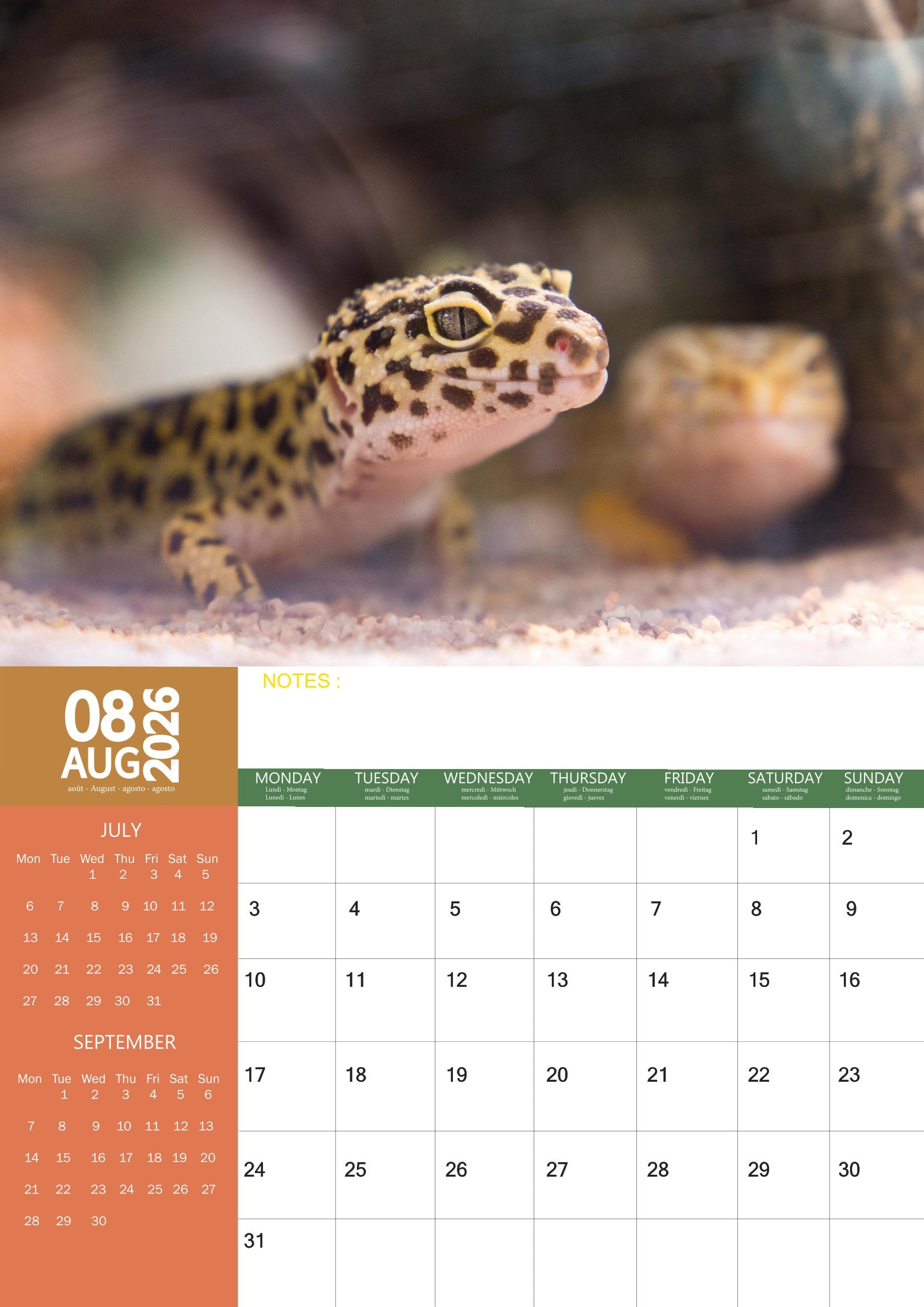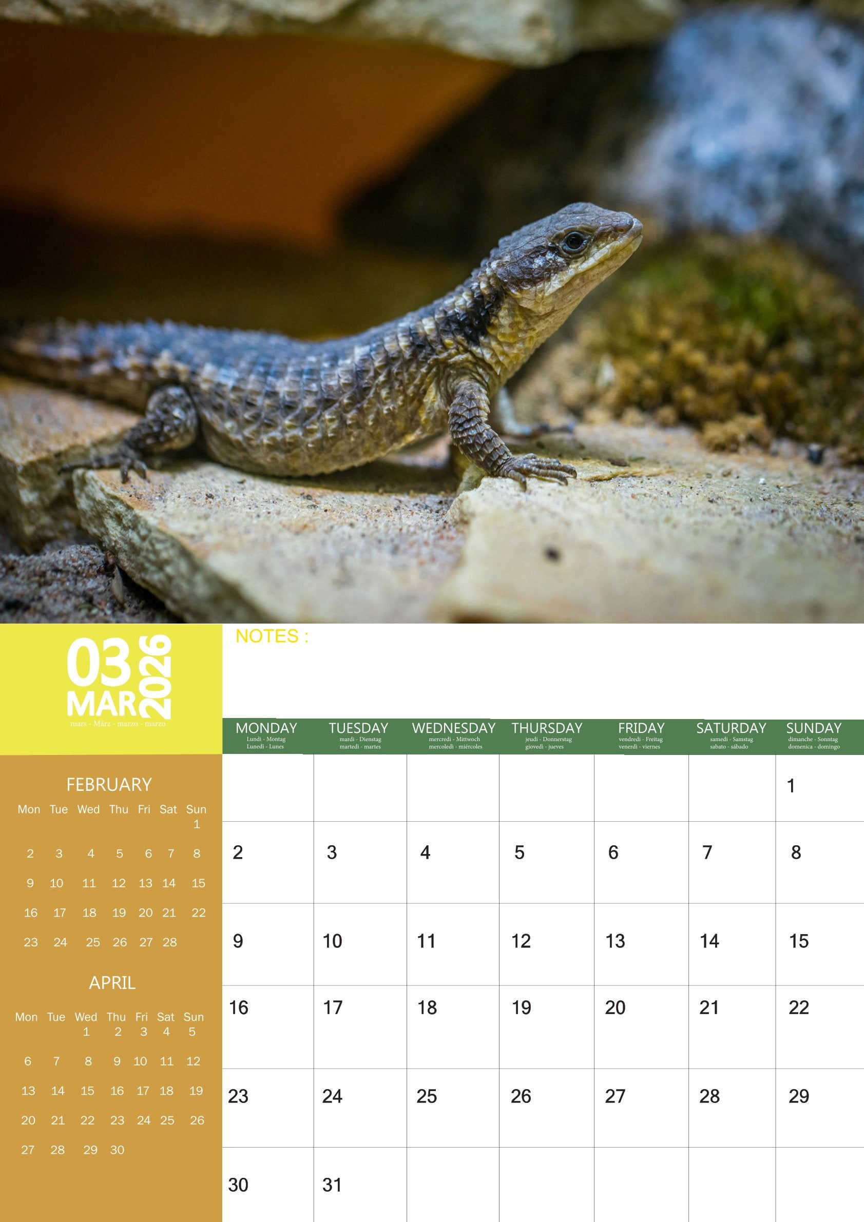 The Lizard Calendar 2026 isn’t just a calendar—it’s a year-long journey into the extraordinary world of reptiles. From geckos and iguanas to chameleons and monitor lizards, each month delivers a captivating look at these often-overlooked but fascinating creatures.
