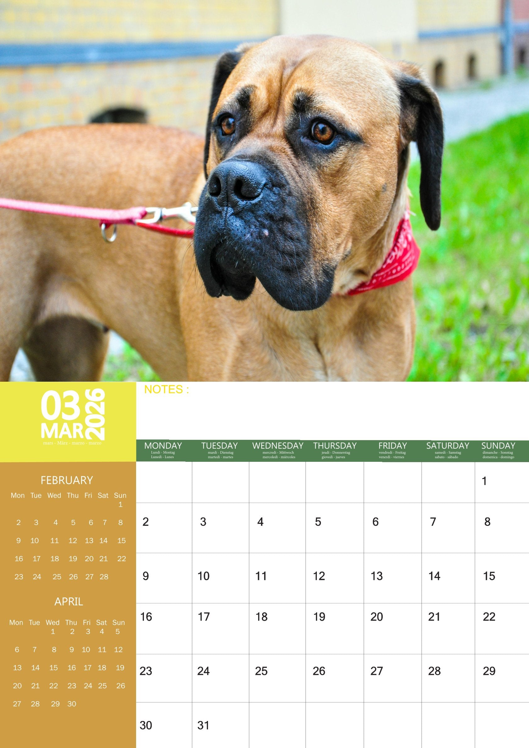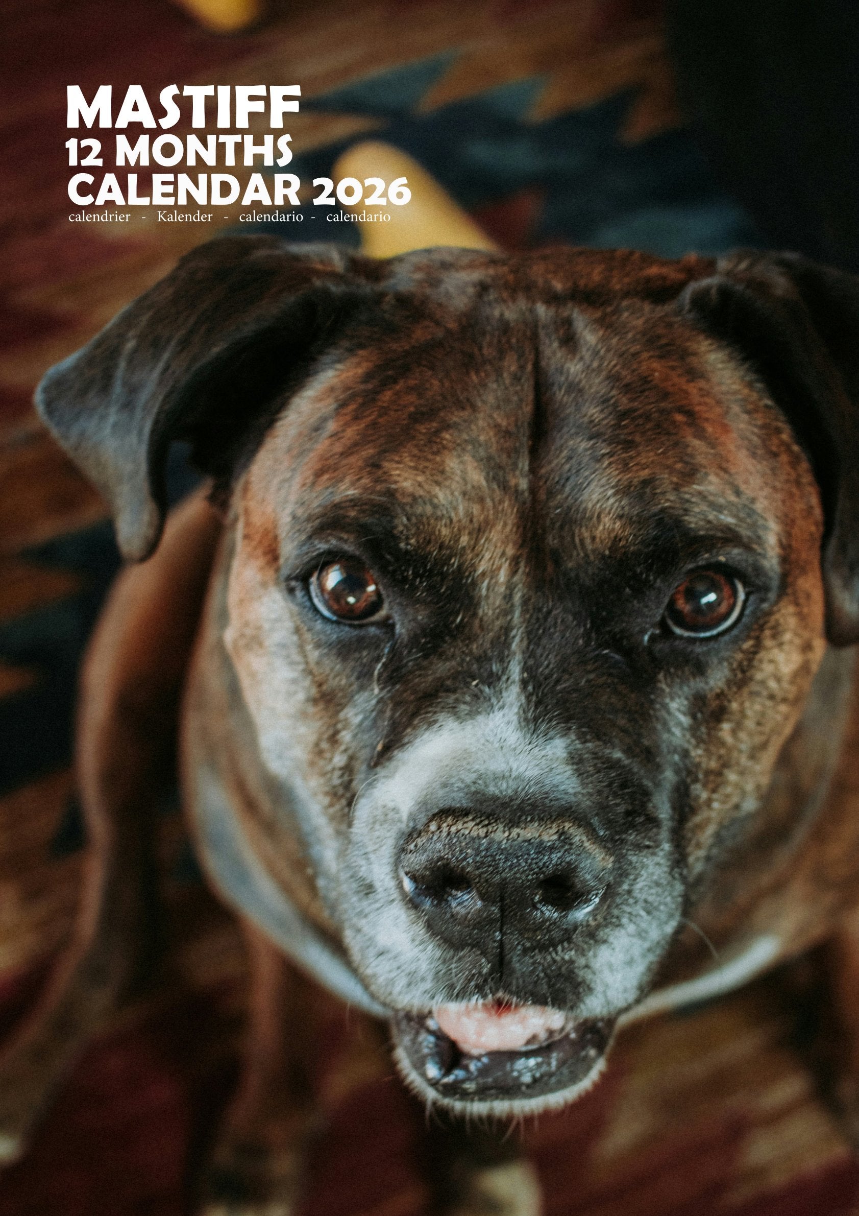Celebrate the strength, dignity, and loyalty of the Mastiff with the Mastiff Calendar 2026. Featuring 12 striking photographs, this calendar captures the breed’s impressive size, noble expression, and gentle nature. Each month showcases the Mastiff’s protective yet affectionate personality, making it the perfect calendar for fans of this majestic breed.
