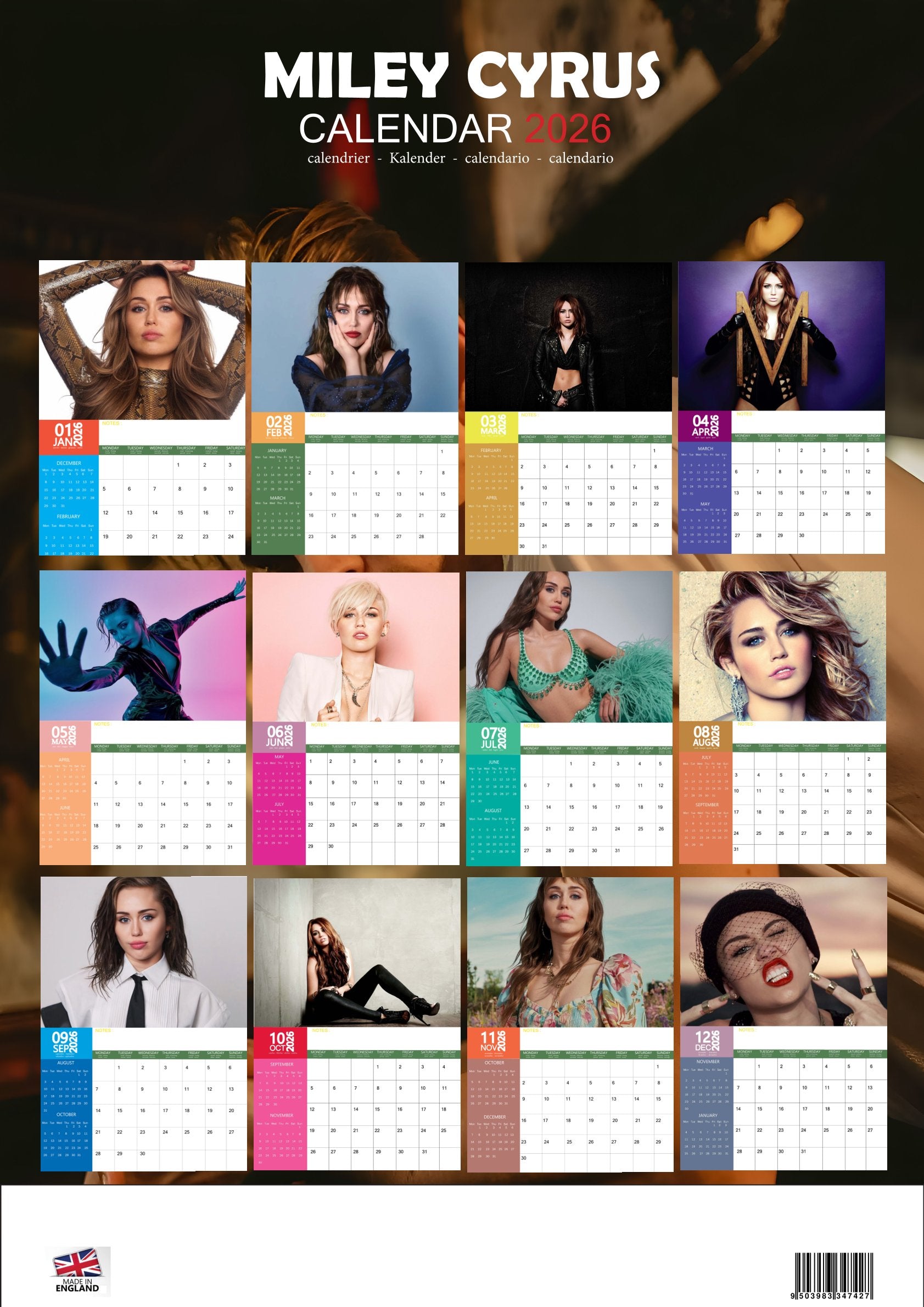 Celebrate a year with one of music’s most fearless and versatile performers in the Miley Cyrus Calendar 2026. Featuring 12 dynamic images, this calendar captures Miley’s evolution as a singer, performer, and style icon—from powerful live shows to intimate, artistic portraits. Each month reflects her bold personality and ever-evolving artistry.