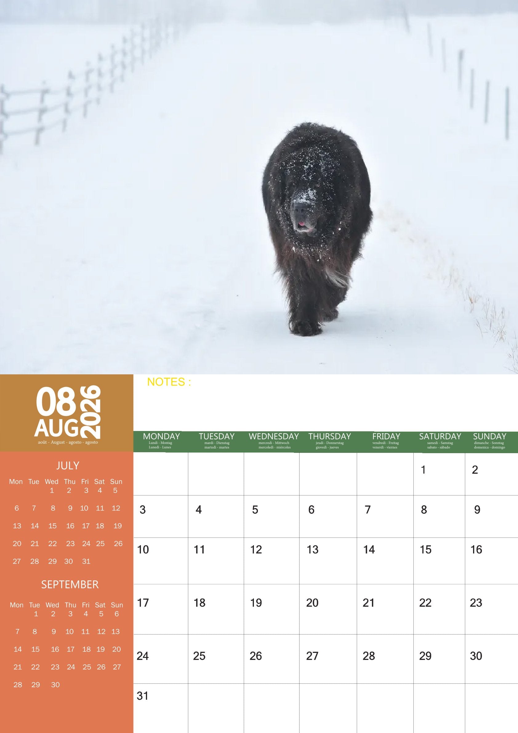 The Newfoundland Calendar 2026 is more than just a calendar—it’s a year-long tribute to one of the most beloved and gentle breeds. With stunning photography and a practical design, it brings the Newfoundland’s loyalty, kindness, and affectionate spirit into your home throughout the year.