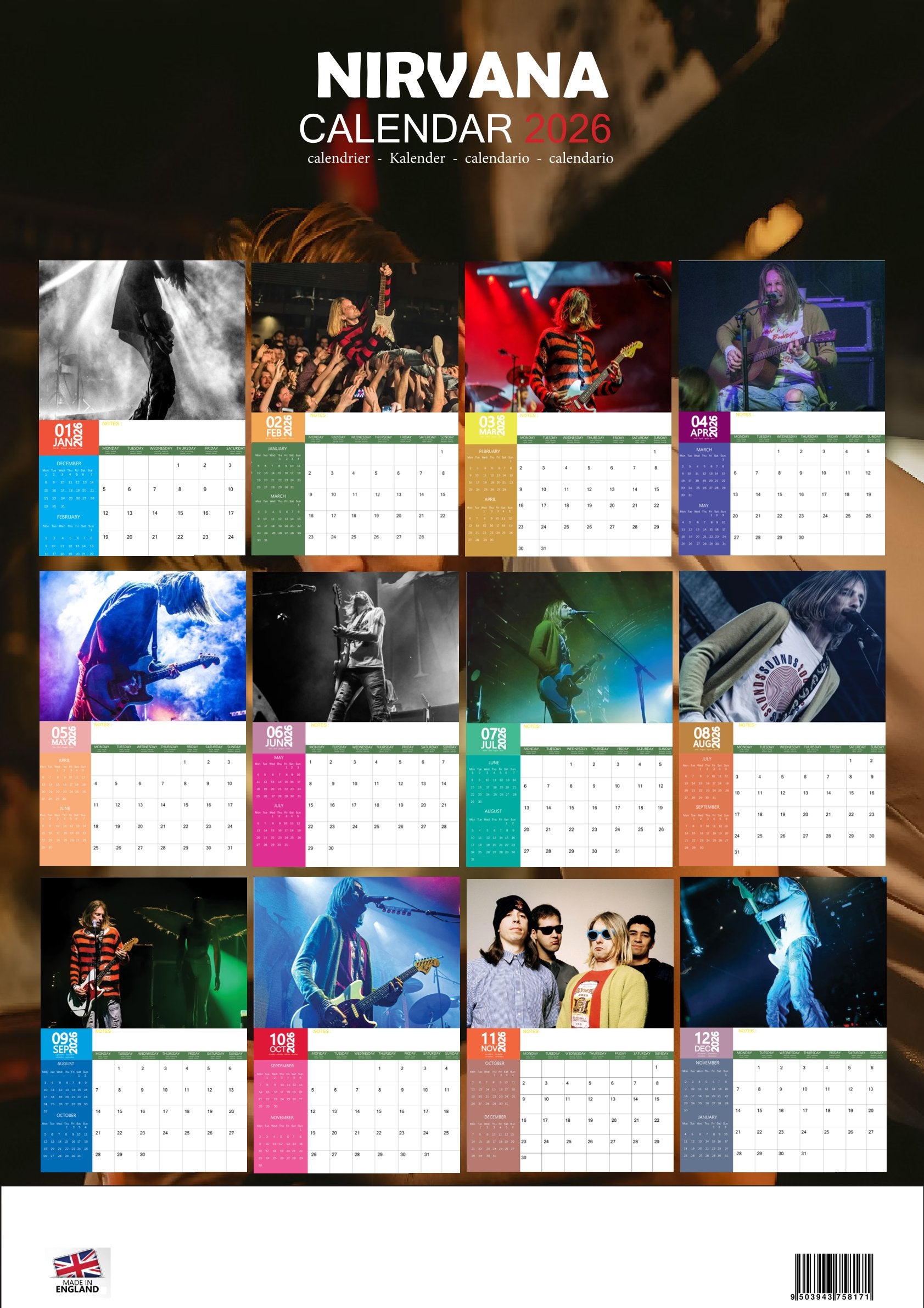 The Nirvana Calendar 2026 is more than a way to mark the days—it’s a tribute to a band that changed the music landscape forever. With iconic imagery and timeless appeal, it’s a must for any true fan of rock history.