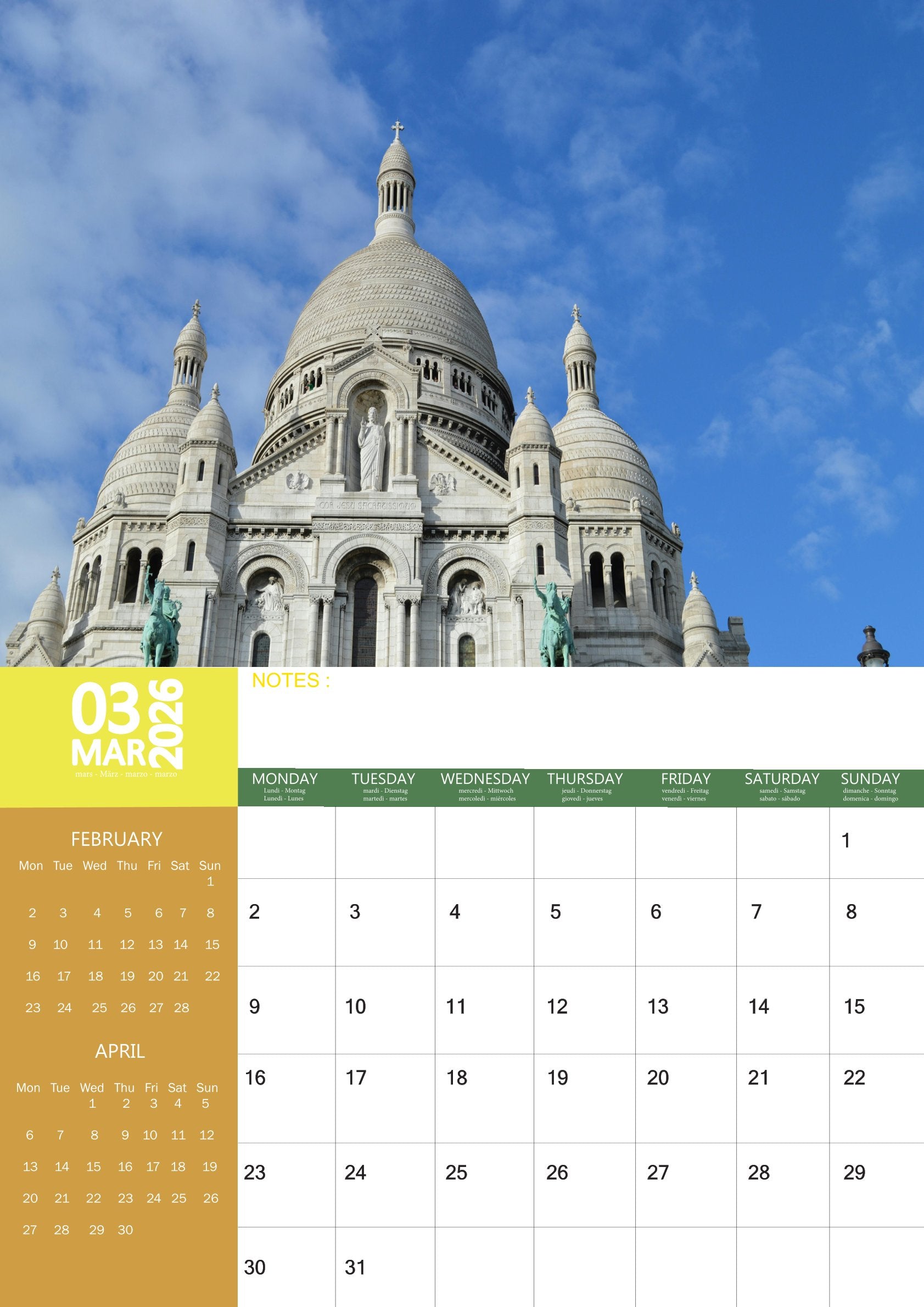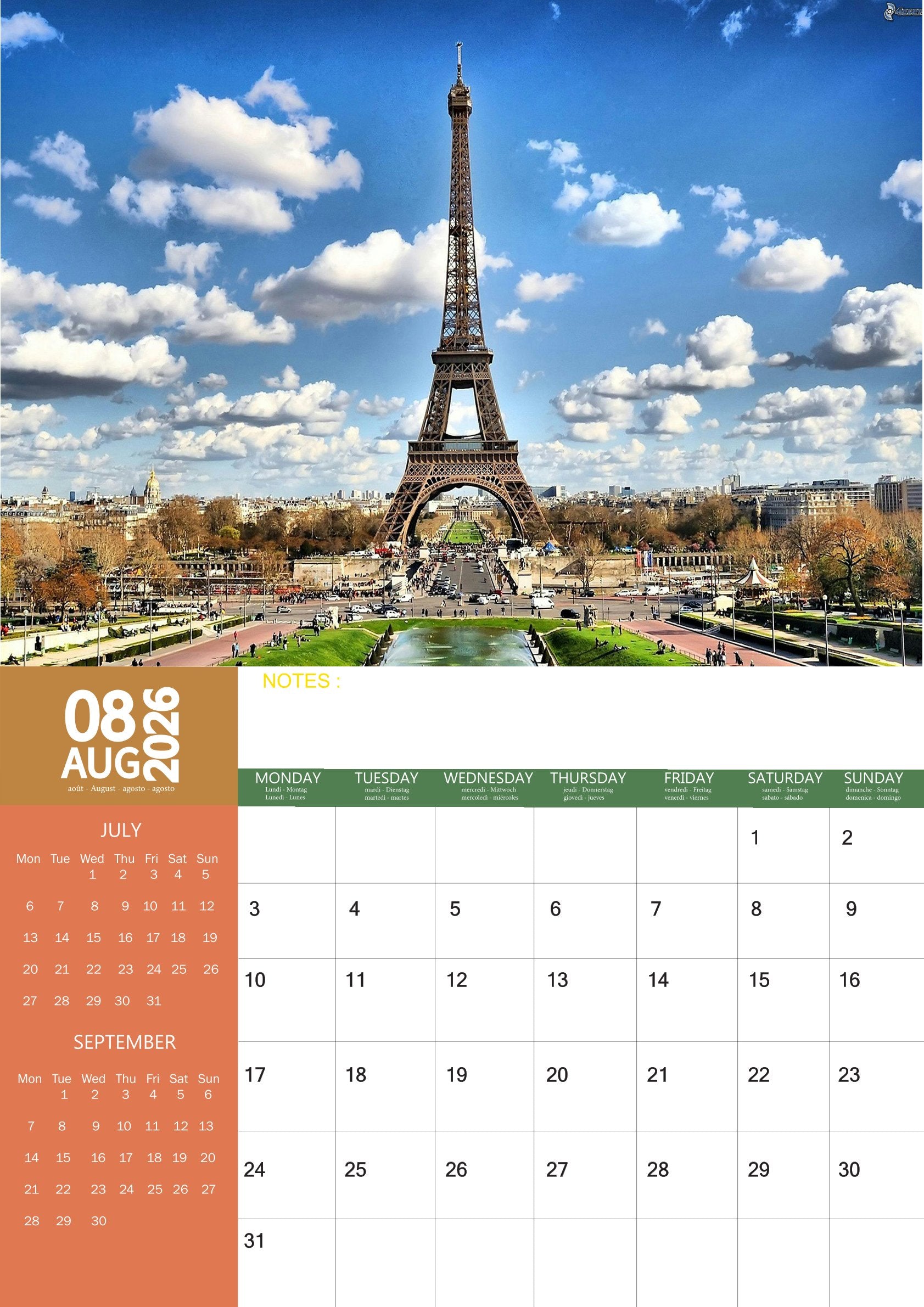 Celebrate the romance, charm, and timeless beauty of the City of Light with the Paris Calendar 2026. Featuring 12 stunning images, this calendar showcases Paris’s most iconic landmarks, elegant streets, and breathtaking views. From the Eiffel Tower and Notre-Dame to the Louvre, Montmartre, and the Seine at sunset, each month captures the magic that makes Paris unforgettable.