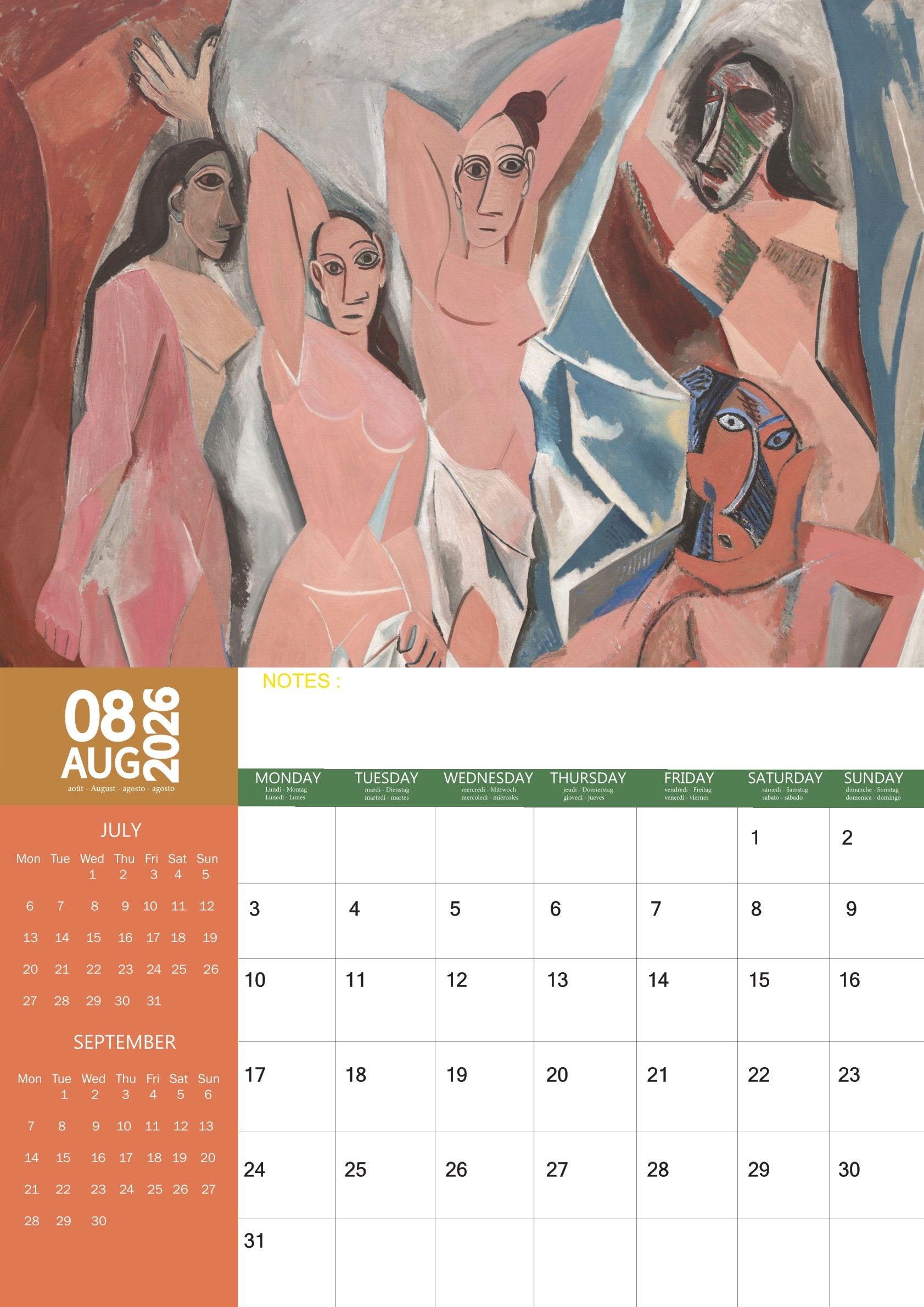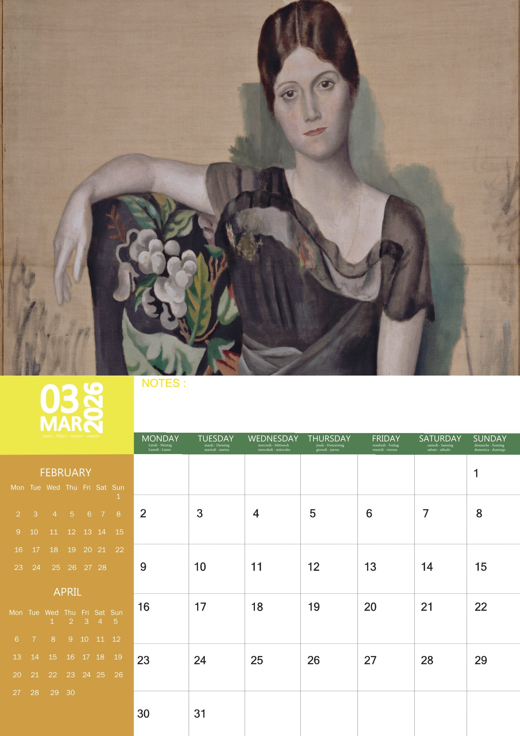 Celebrate the genius of one of the most influential artists of the 20th century with the Picasso Calendar 2026. Featuring 12 striking reproductions of Pablo Picasso’s iconic works, this calendar highlights the creativity, innovation, and boldness that defined his career. From cubism to his expressive portraits, each month brings a new masterpiece to admire.
