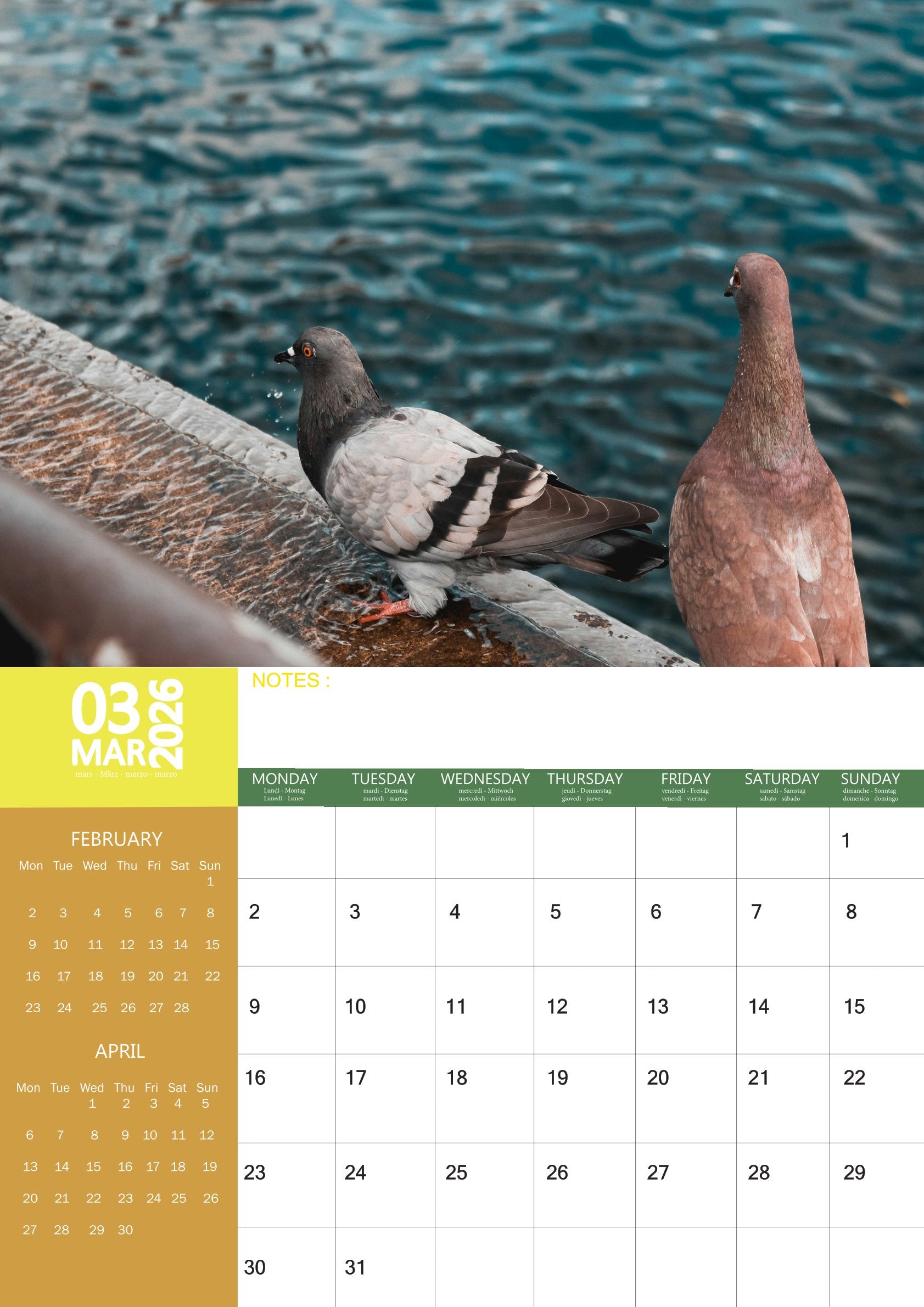 Celebrate one of the most familiar yet fascinating birds with the Pigeons Calendar 2026. Featuring 12 striking photographs, this calendar showcases the beauty, intelligence, and variety of pigeons, from urban city dwellers to rare fancy breeds admired by enthusiasts worldwide.