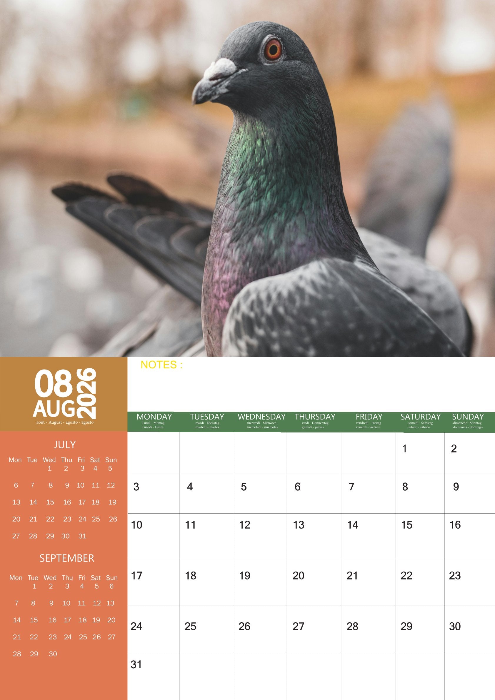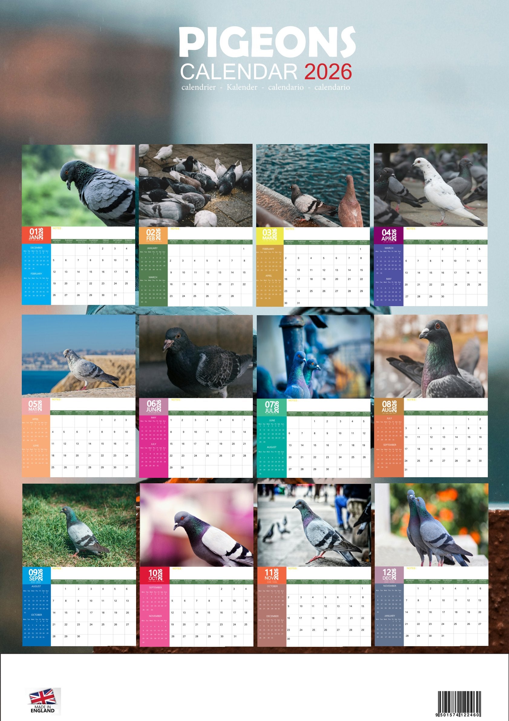 The Pigeons Calendar 2026 brings new appreciation to a bird often overlooked. With stunning photography, this calendar highlights their grace, resilience, and the special bond pigeons have shared with humans throughout history. A must-have for bird lovers and collectors alike.