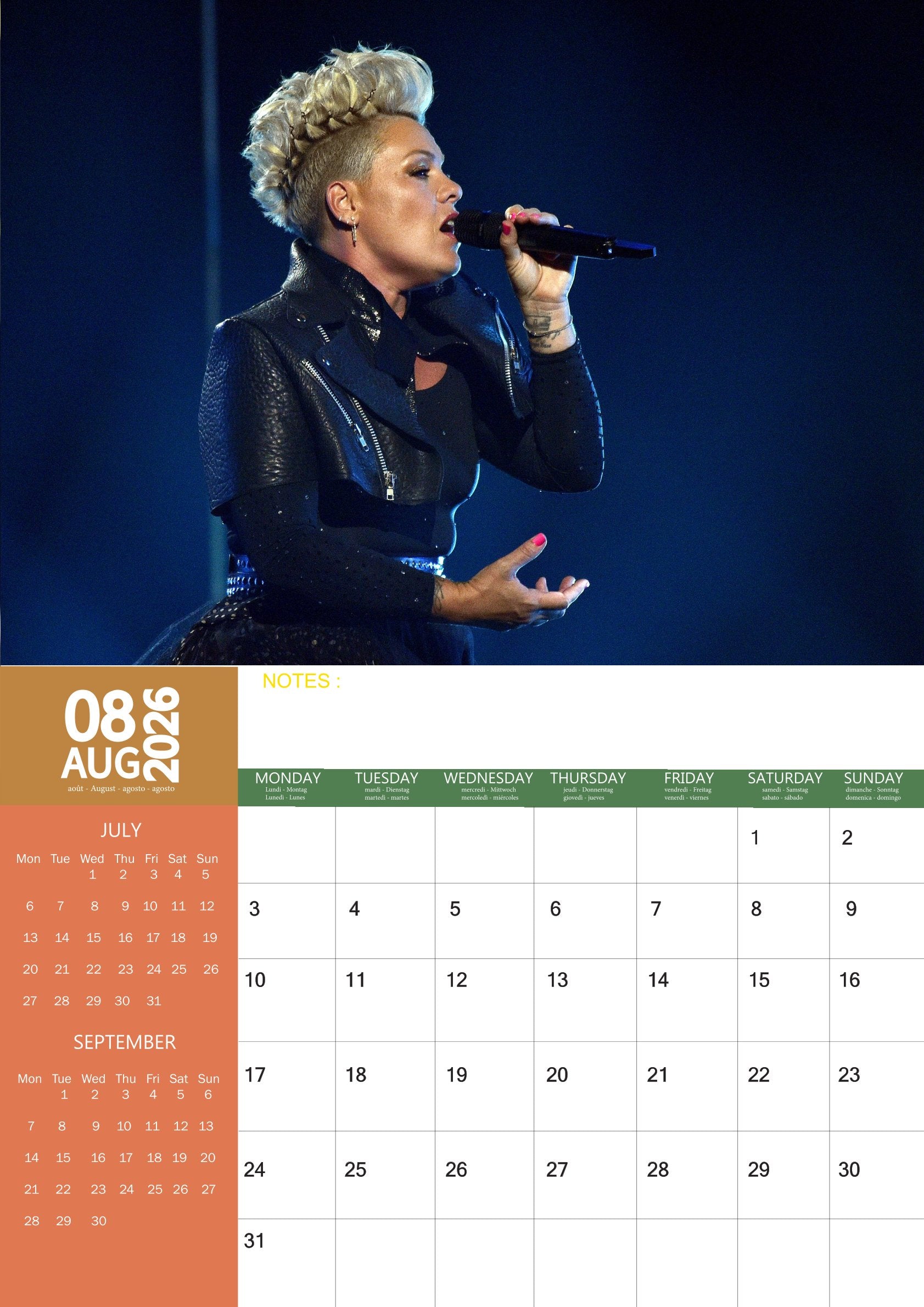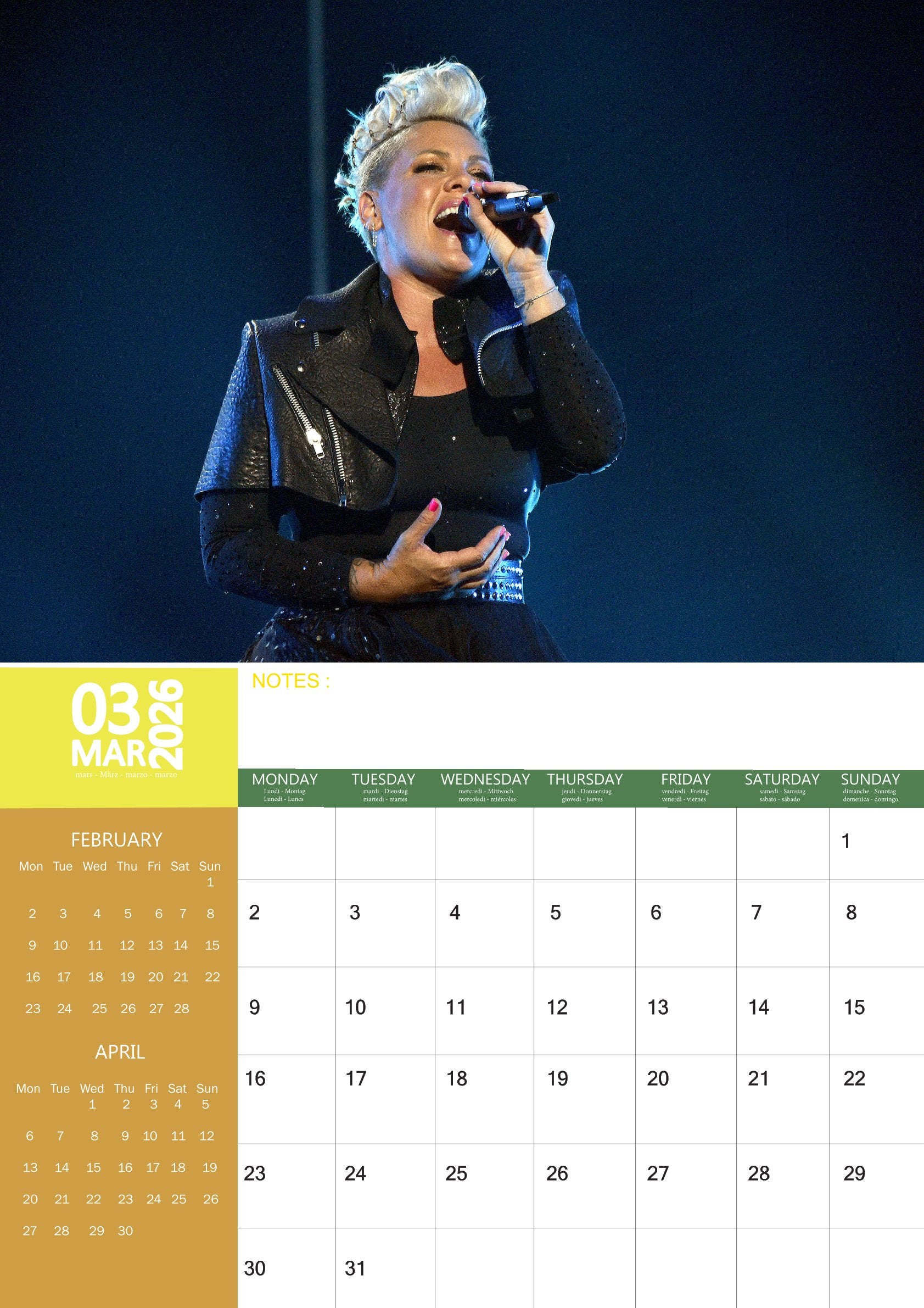 The Pink Calendar 2026 is the perfect tribute to an artist who continues to inspire with her powerhouse vocals, daring performances, and unstoppable spirit. Both practical and visually stunning, it’s a must-have for fans who want to enjoy Pink’s presence all year round.