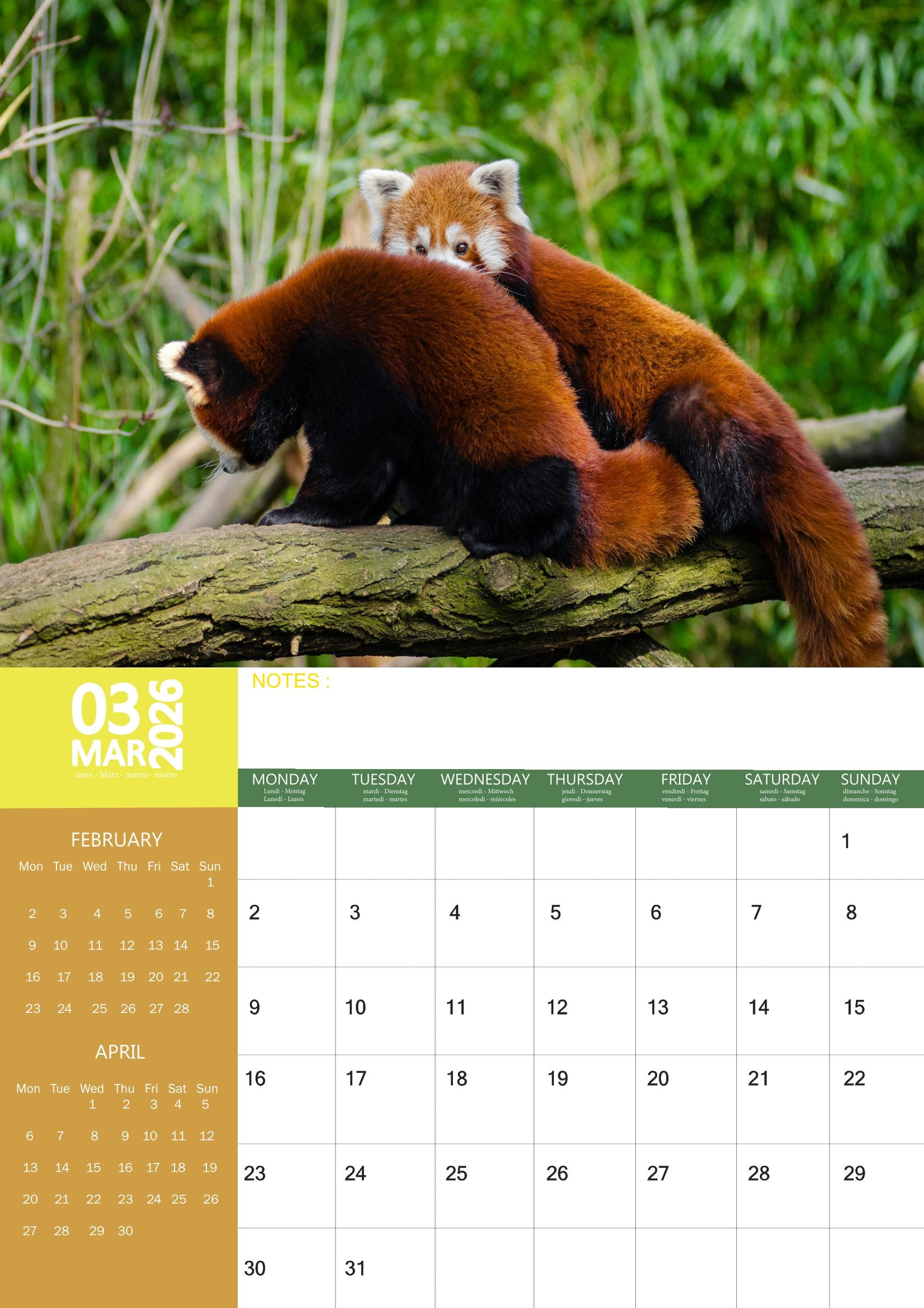Celebrate the enchanting beauty of one of the world’s most beloved creatures with the Red Panda Calendar 2026. Featuring 12 stunning images of red pandas in their natural habitats, this calendar captures their playful personalities, fluffy charm, and endearing expressions all year round.