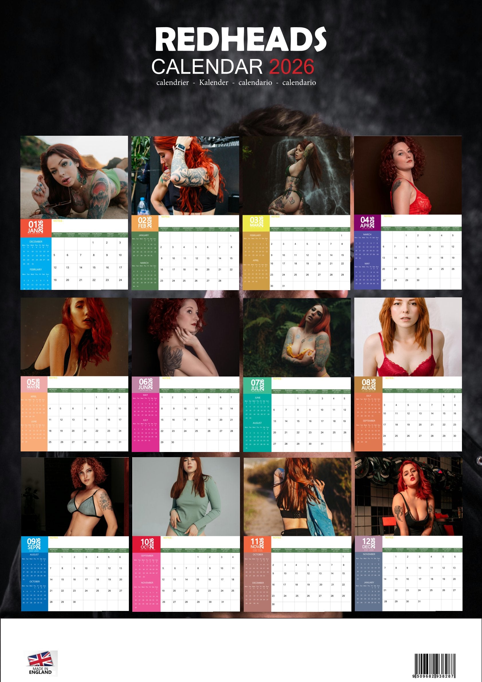 Celebrate fiery beauty and striking charm with the Redheads Calendar 2026. Featuring 12 stunning images of red-haired models, this calendar highlights confidence, personality, and unique style. Each month delivers a fresh look at the allure and elegance of redheads, making it a perfect addition to any collection.