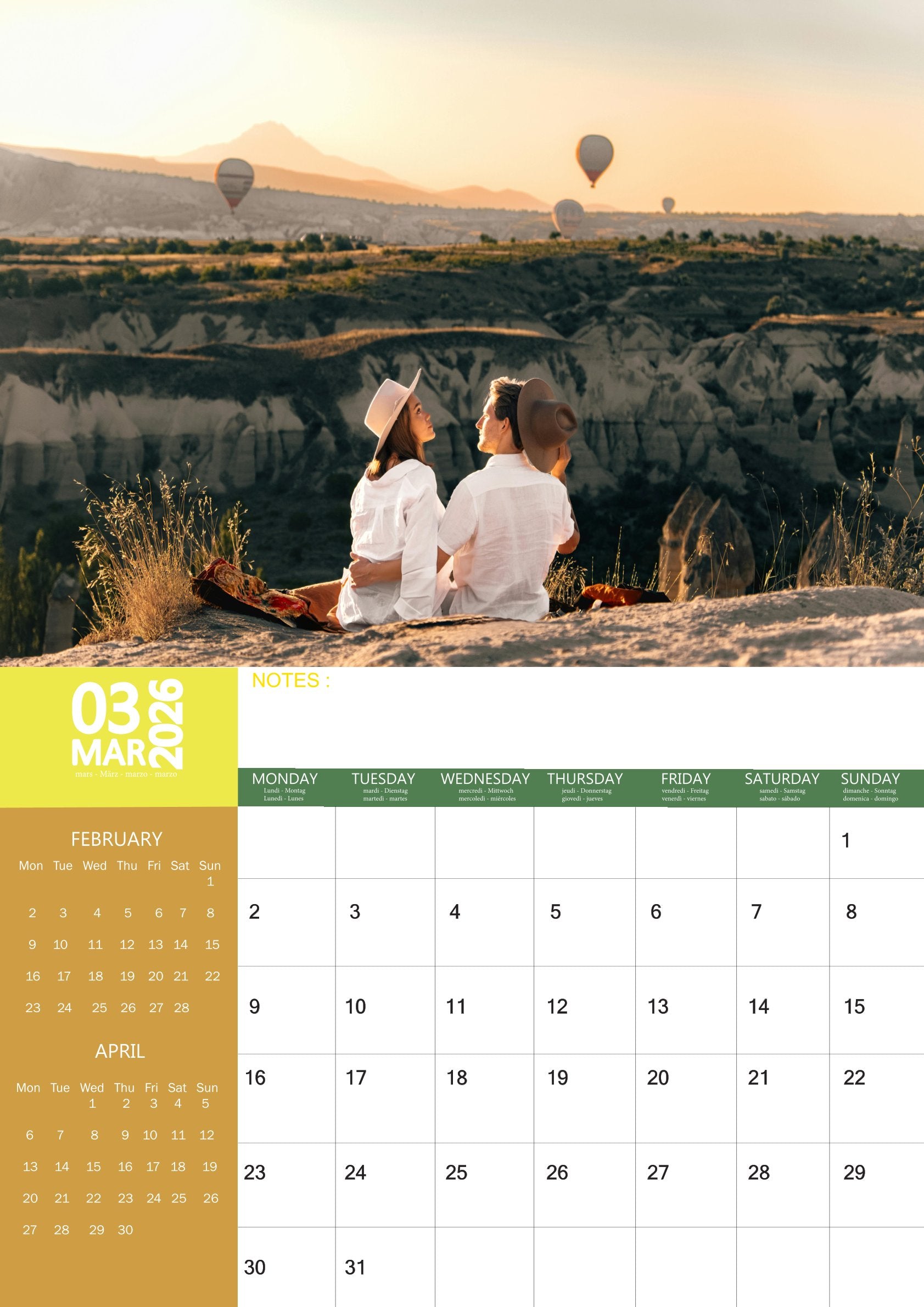 Celebrate love and connection all year round with the Romantic Europe Calendar 2026. Featuring 12 beautifully captured images of couples, dreamy settings, and intimate moments, this calendar brings warmth, tenderness, and inspiration to every month. From sunsets on the beach to candlelit evenings and scenic strolls through enchanting cities, it’s the perfect way to surround yourself with love every day.