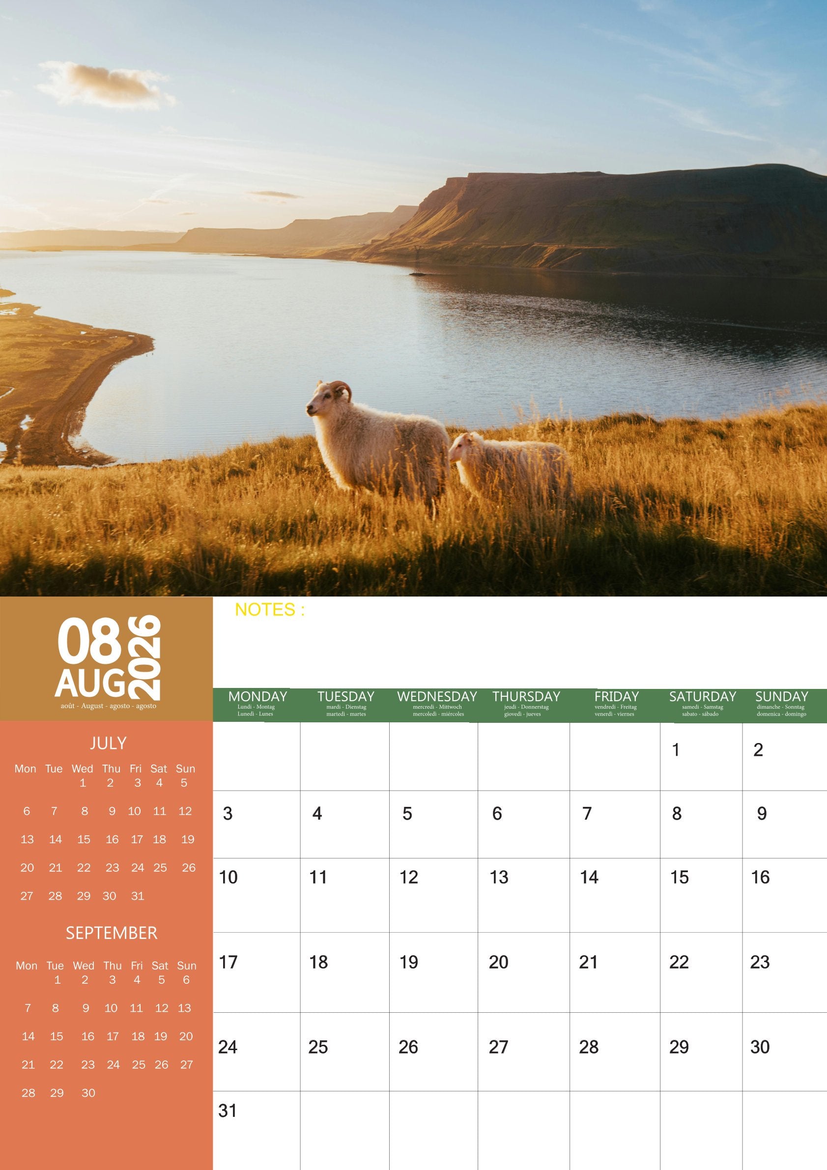 Celebrate the charm of the countryside with the Sheep Calendar 2026. Featuring 12 delightful images of sheep in meadows, hills, and farmlands, this calendar captures the gentle beauty and timeless presence of these beloved farm animals. Each month brings a new scene of peaceful rural life, perfect for bringing a touch of nature to your walls.