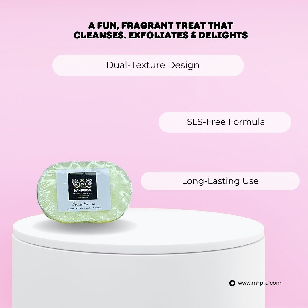 The Foamy Banana Soap Sponge is a dual-purpose bath product that combines a textured sponge with banana-scented glycerine soap. It gently buffs away dead skin cells while cleansing and moisturizing your skin, leaving behind a light, fruity fragrance that lingers long after you rinse.