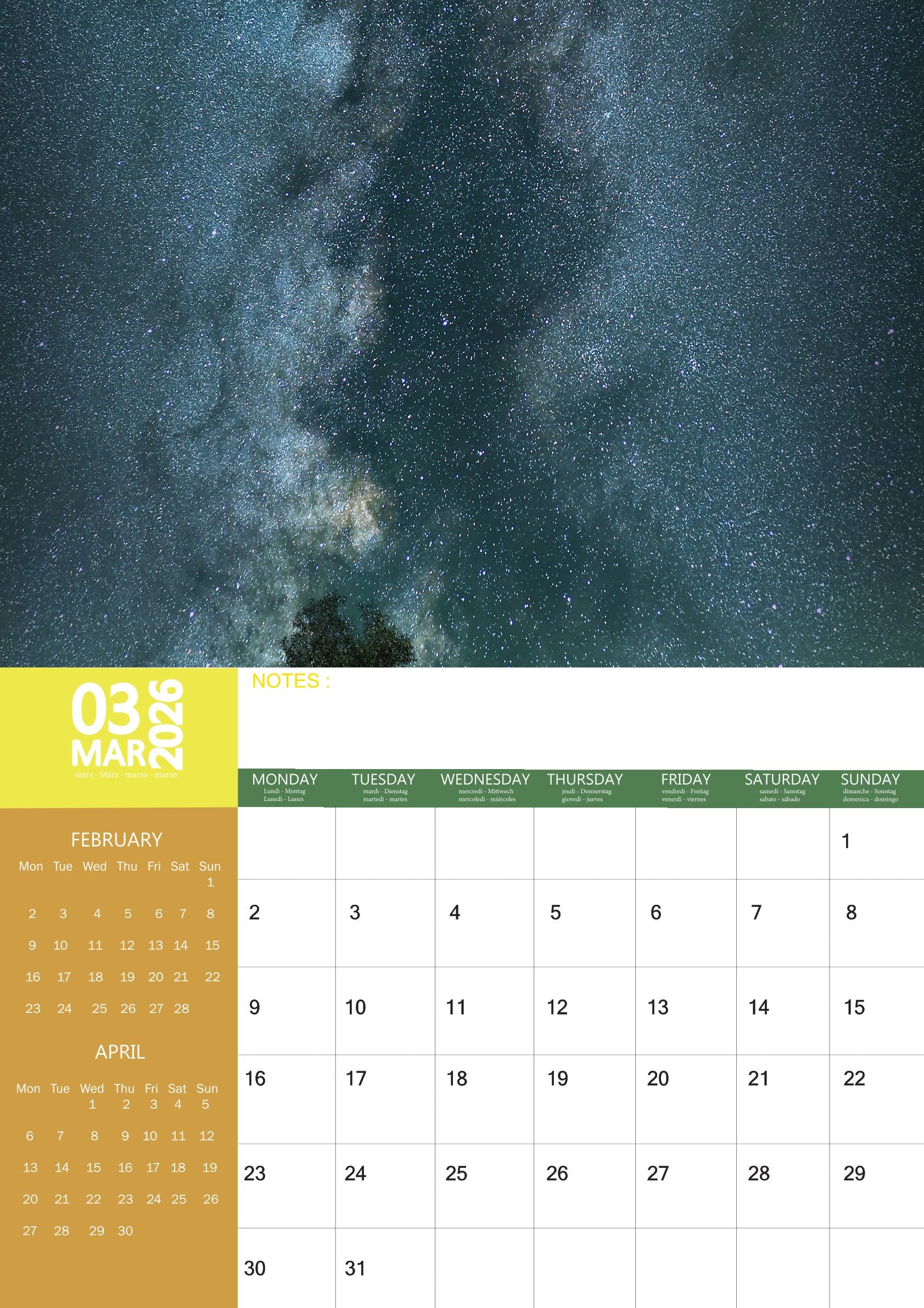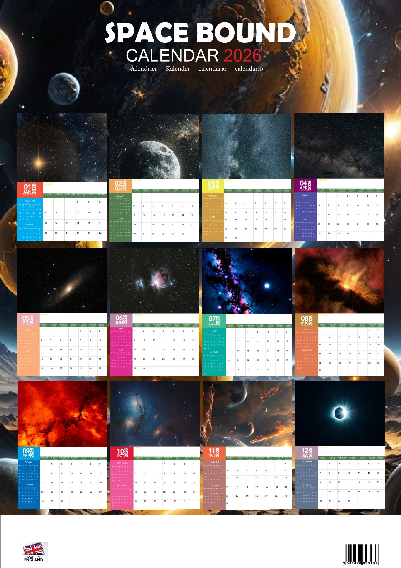 Embark on a journey beyond Earth with the Space Bound Calendar 2026. Featuring 12 awe-inspiring images of galaxies, planets, stars, and nebulae, this calendar takes you on a cosmic adventure every month. From dazzling star clusters to breathtaking planetary views, it’s a celebration of the mysteries and beauty of space.