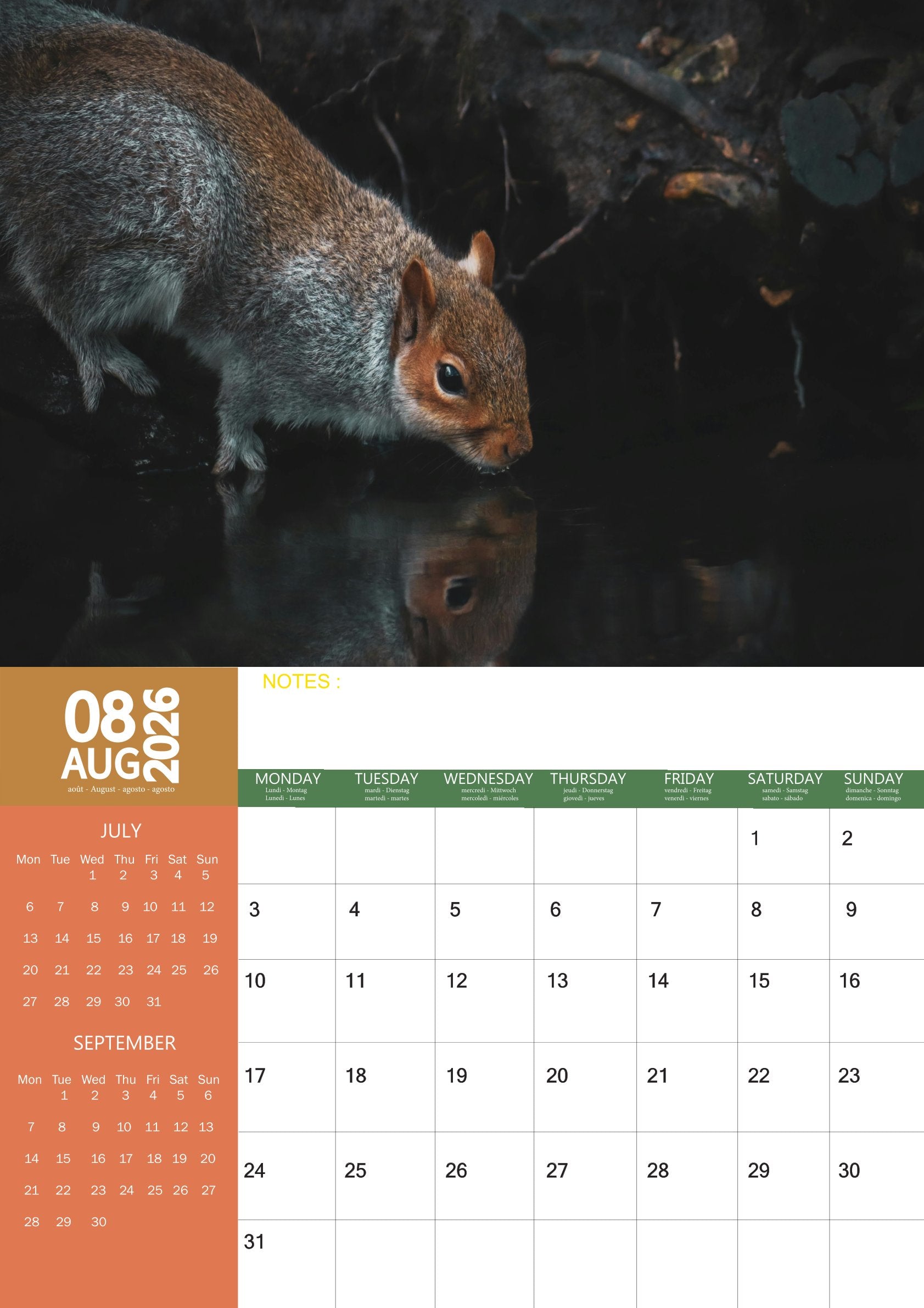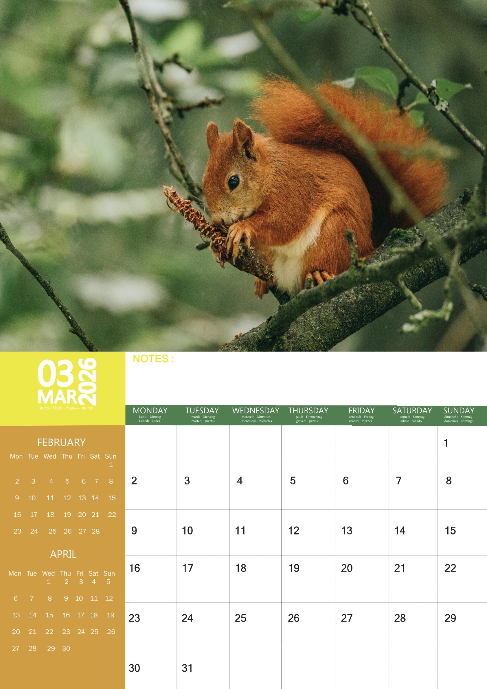 Bring charm and playfulness to your year with the Squirrel Calendar 2026. Featuring 12 delightful images of squirrels in their natural habitats, this calendar captures their lively personalities, bushy tails, and curious expressions.