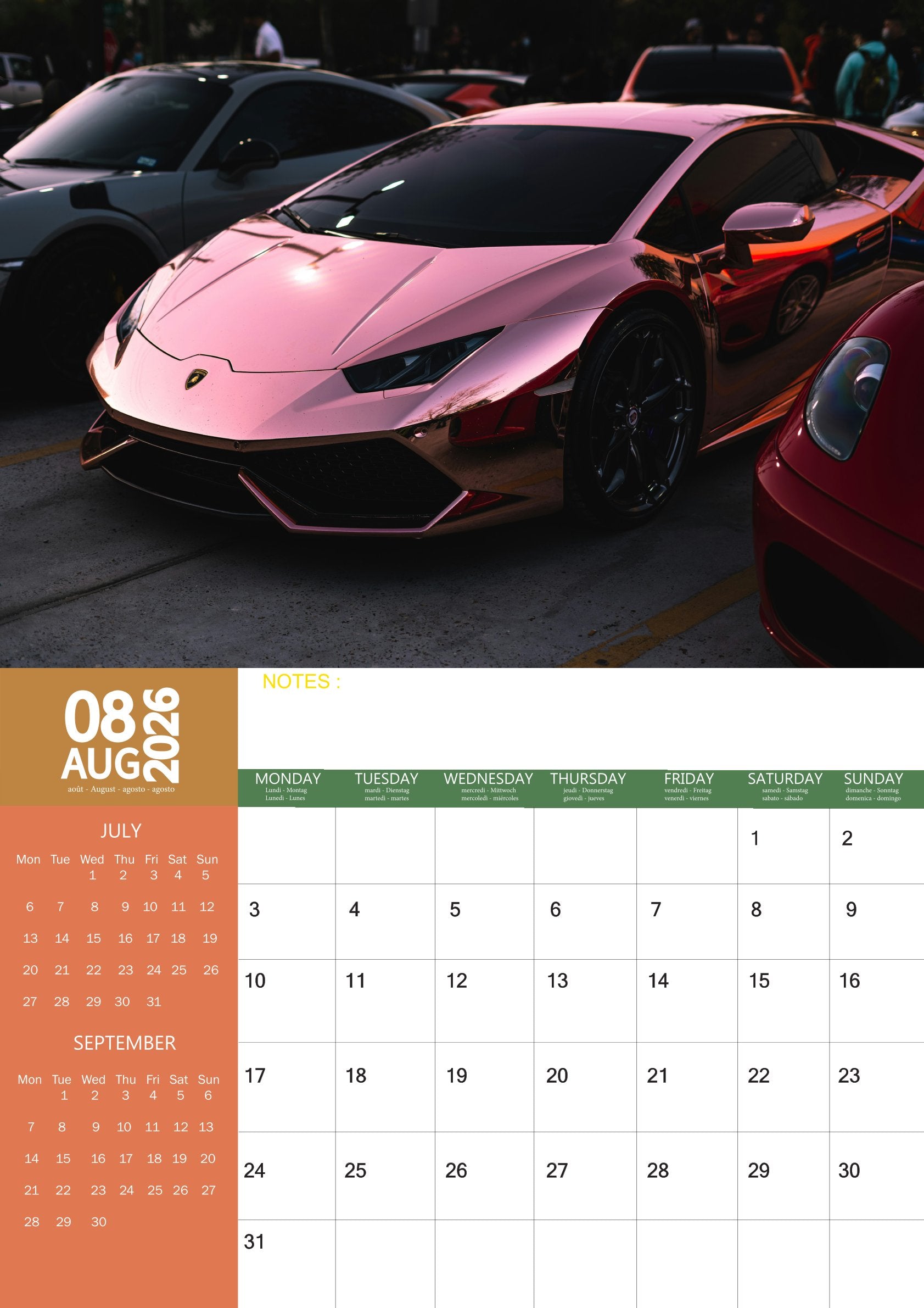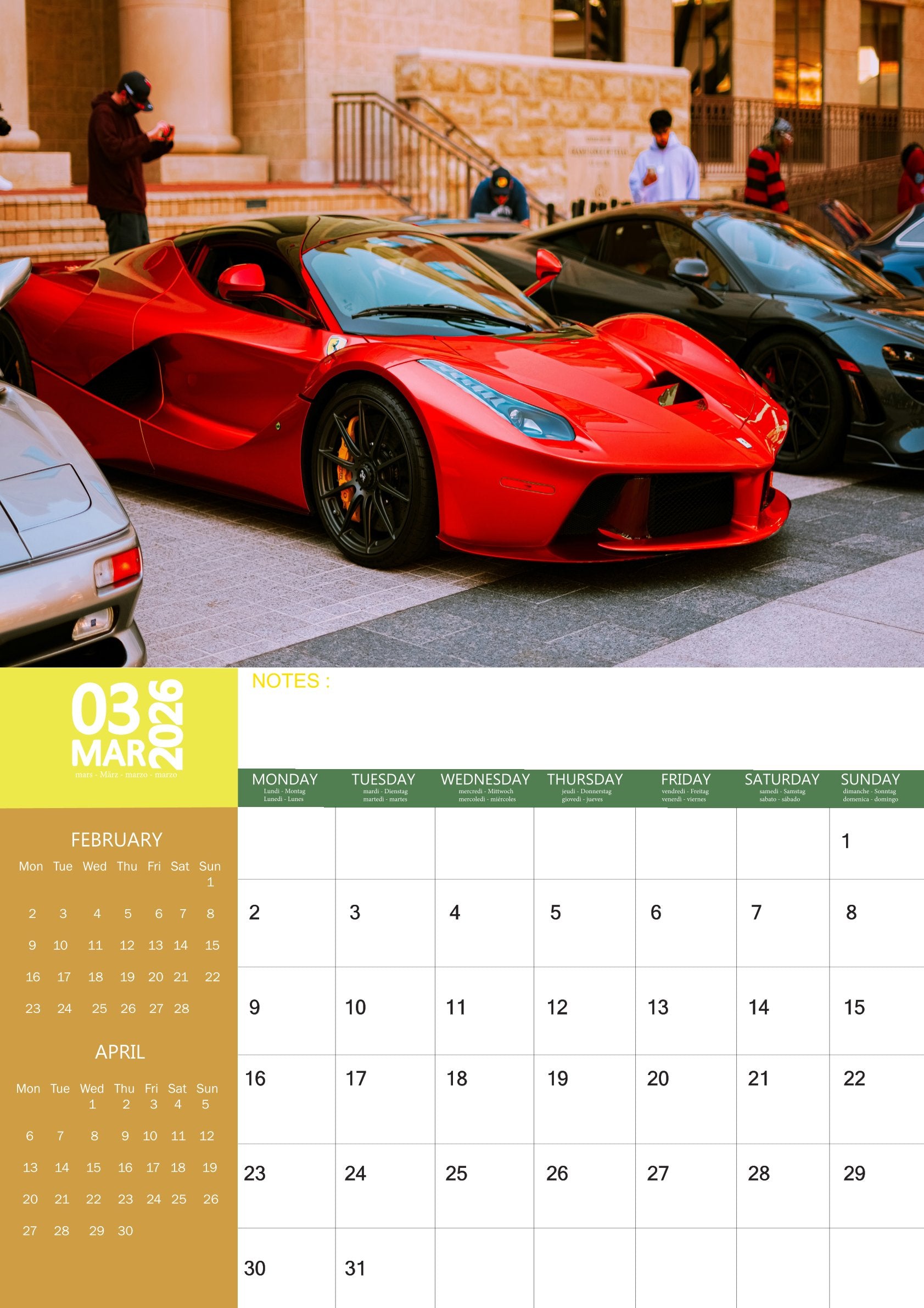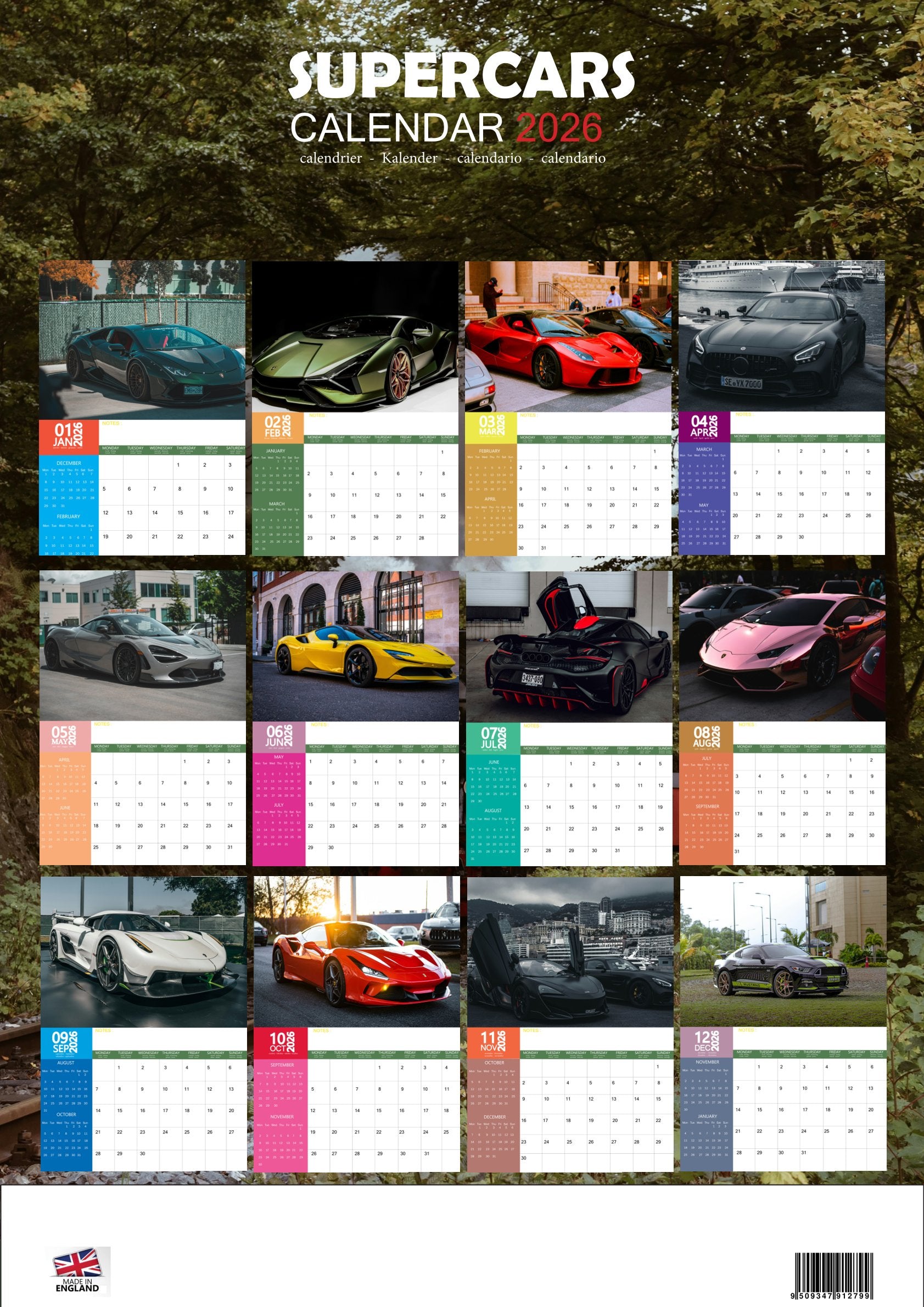 Experience speed, style, and luxury with the Supercars Calendar 2026. Featuring 12 stunning images of the world’s most iconic supercars, this calendar celebrates engineering excellence, design brilliance, and the thrill of high-performance driving. Each month brings the excitement of exotic cars to your walls.