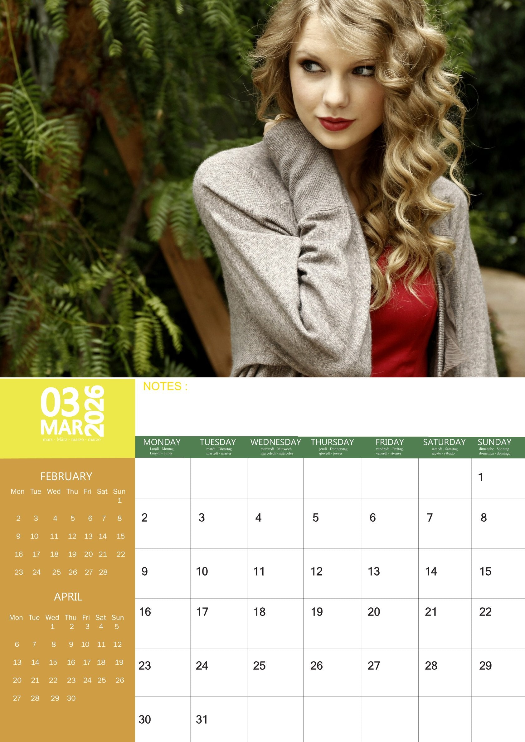 Step into the enchanting world of Taylor Swift with the Taylor Swift Calendar 2026. Featuring 12 dazzling images, this calendar celebrates Taylor’s evolution from country roots to global pop sensation. Each month captures her unique charm, style, and stage presence, making it the ultimate collectible for Swifties everywhere.