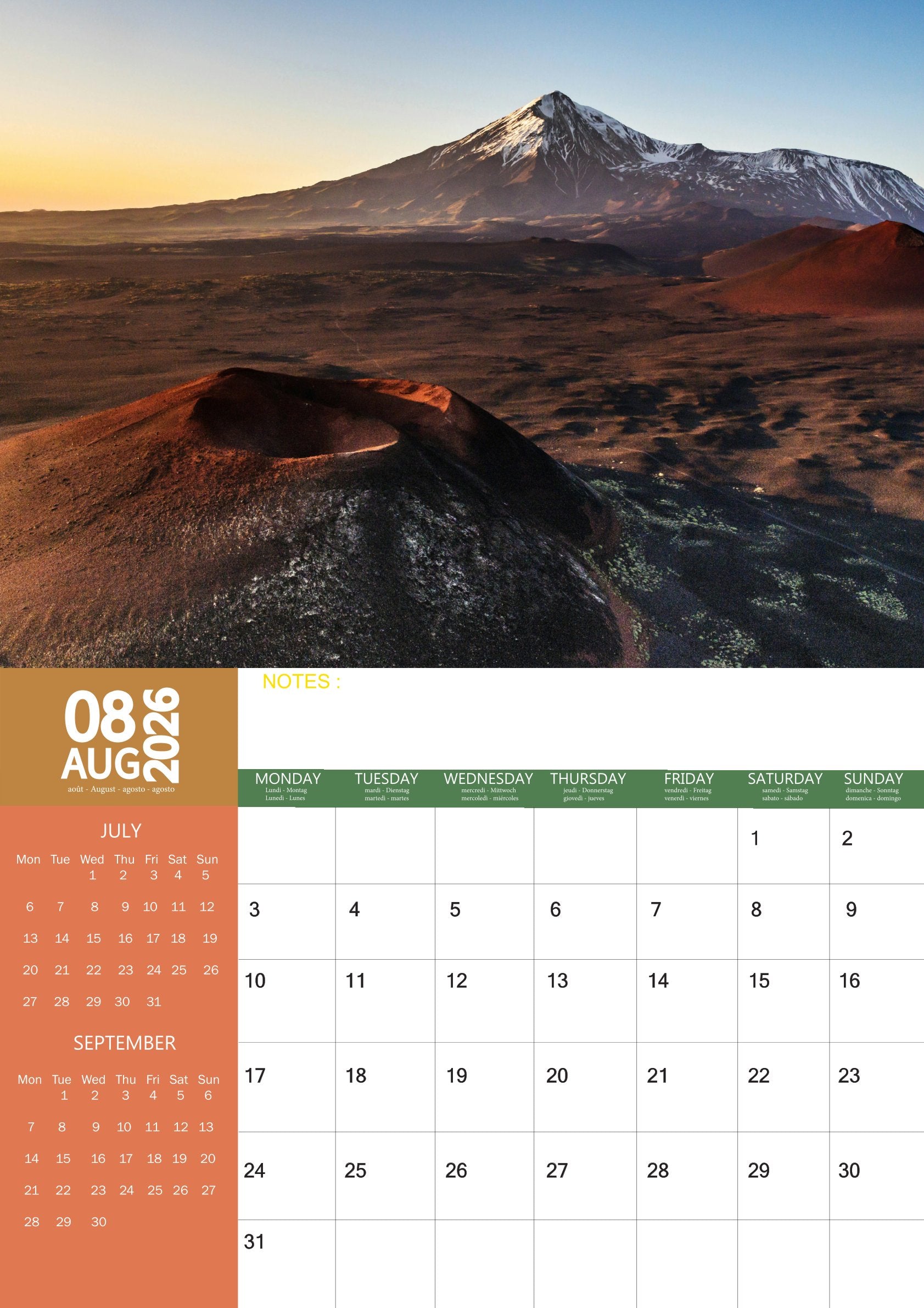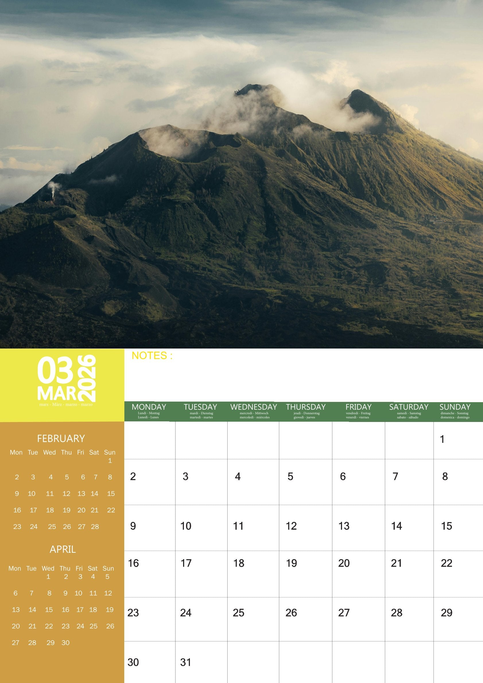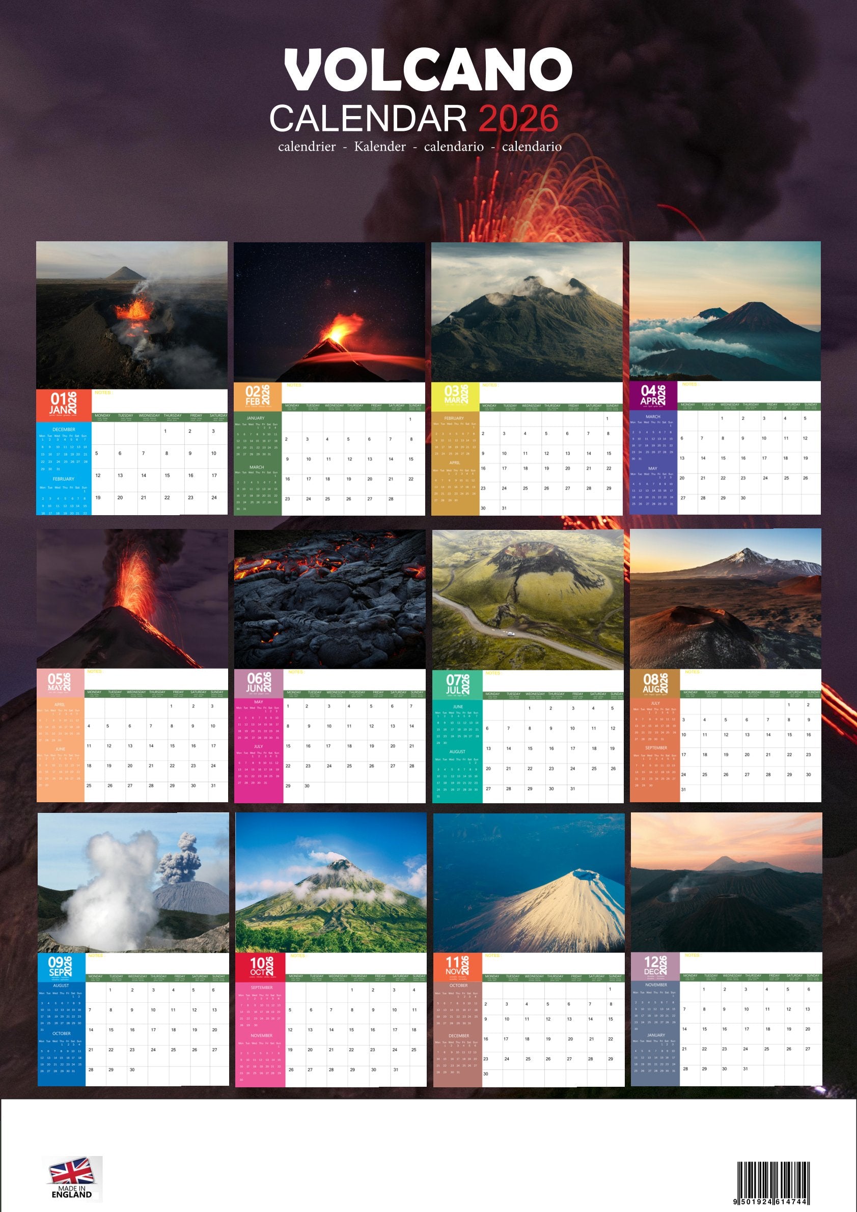 Witness the raw power and beauty of nature with the Volcano Calendar 2026. Each month showcases stunning photography of volcanoes from around the world — from fiery eruptions to majestic dormant peaks. This calendar captures the awe-inspiring drama and serene landscapes shaped by these natural wonders.