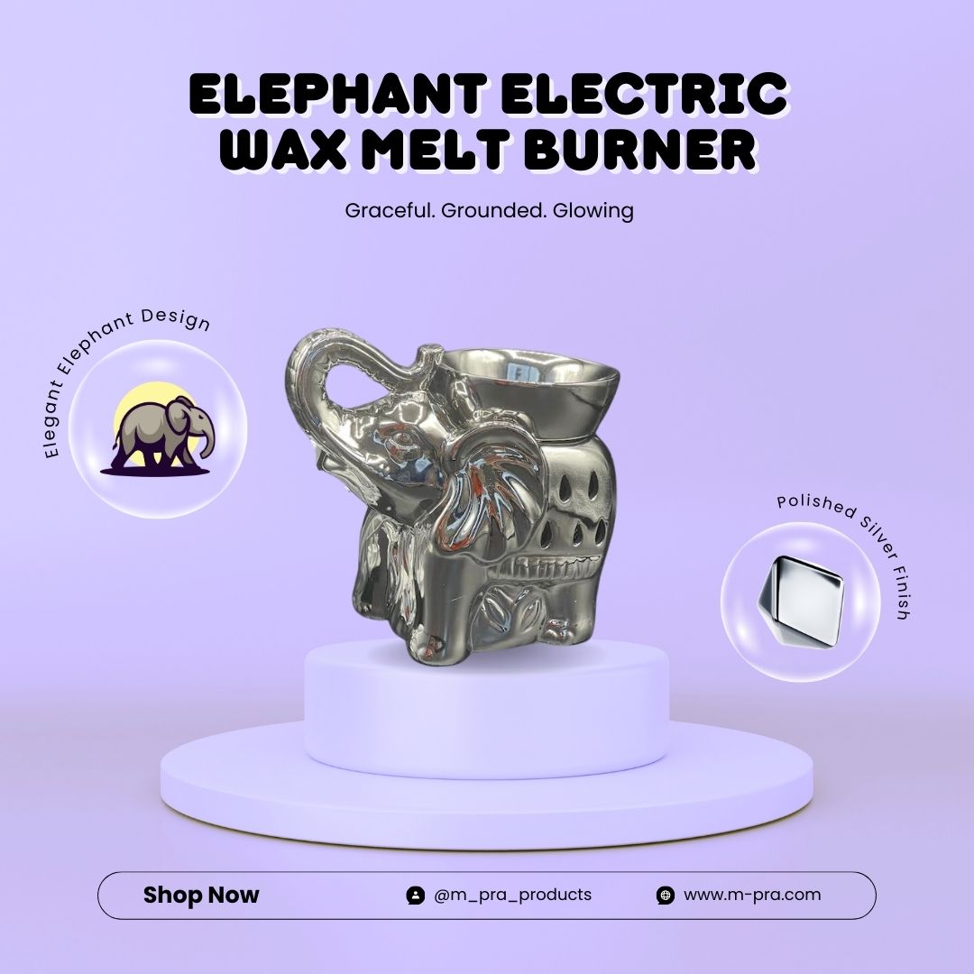 Large Elephant Design Electric Burner in Shiny Silver Finish. This beautifully finished Aroma Lamp has a large removable dish suitable for wax melts or scented oils.