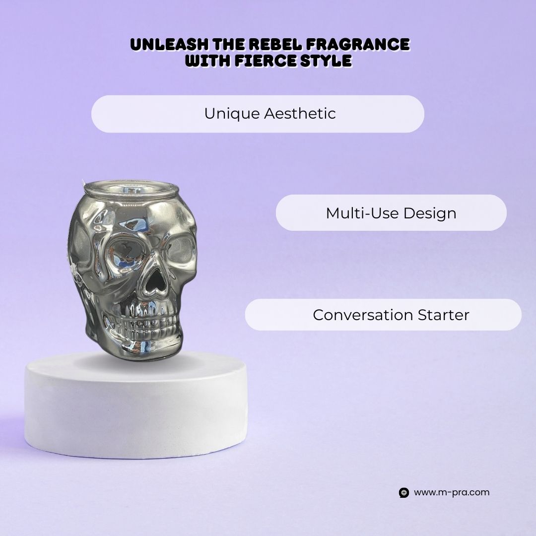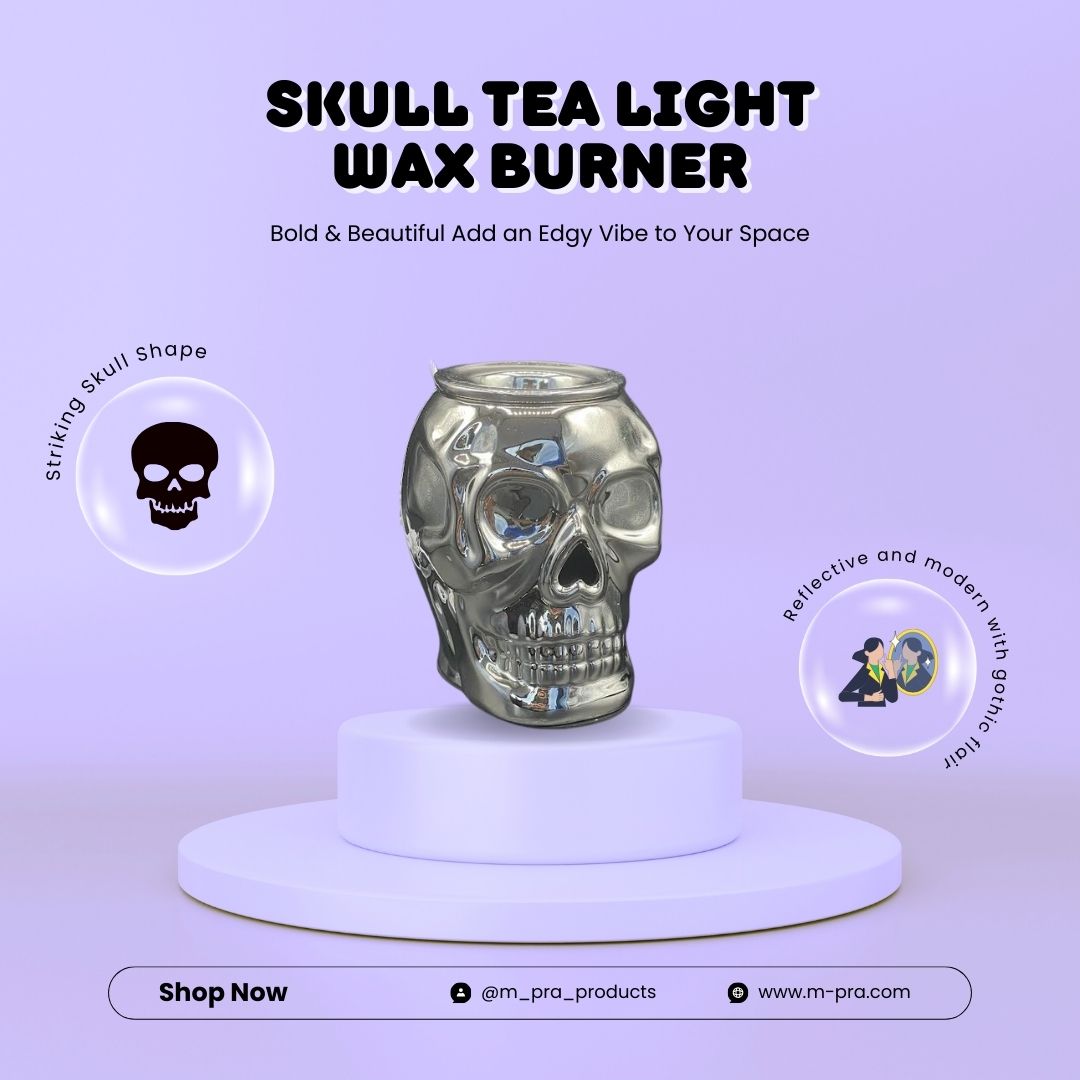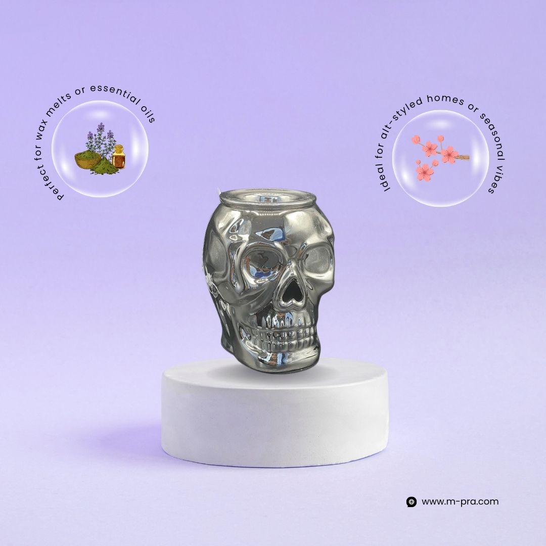 Large Skull Design tea Light Burner in Shiny Silver Finish. This beautifully finished Aroma Lamp has a large dish suitable for wax melts or scented oils.