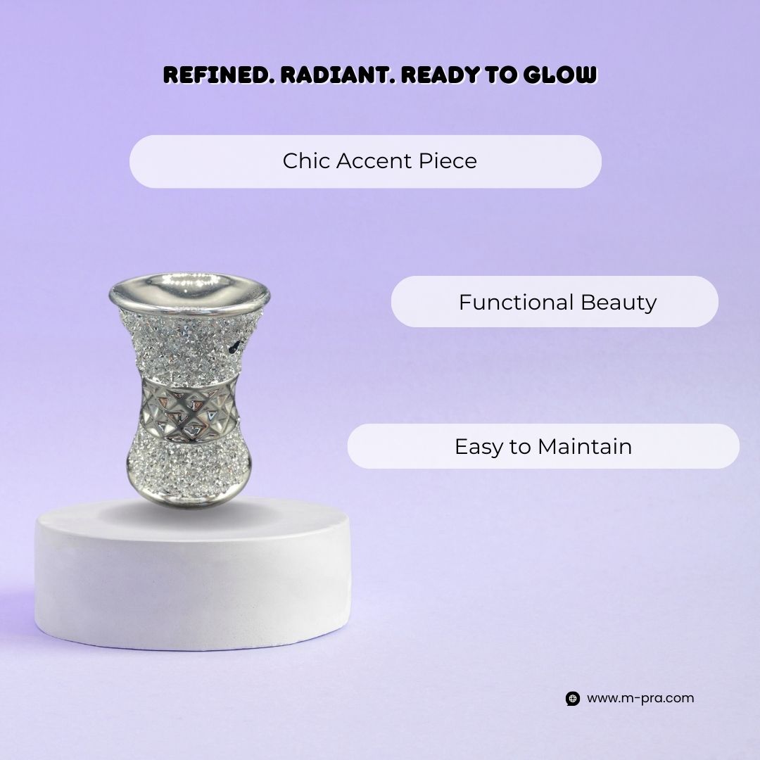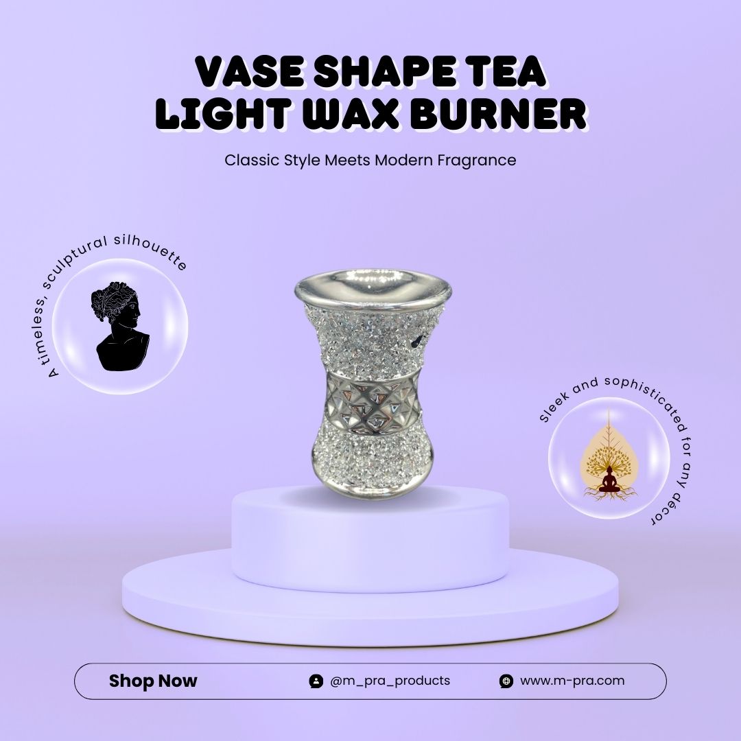 Vase Shape Tea Light Wax Melt Burner in Shiny Silver Finish. This beautifully finished Aroma Lamp has a large dish suitable for wax melts or scented oils.
